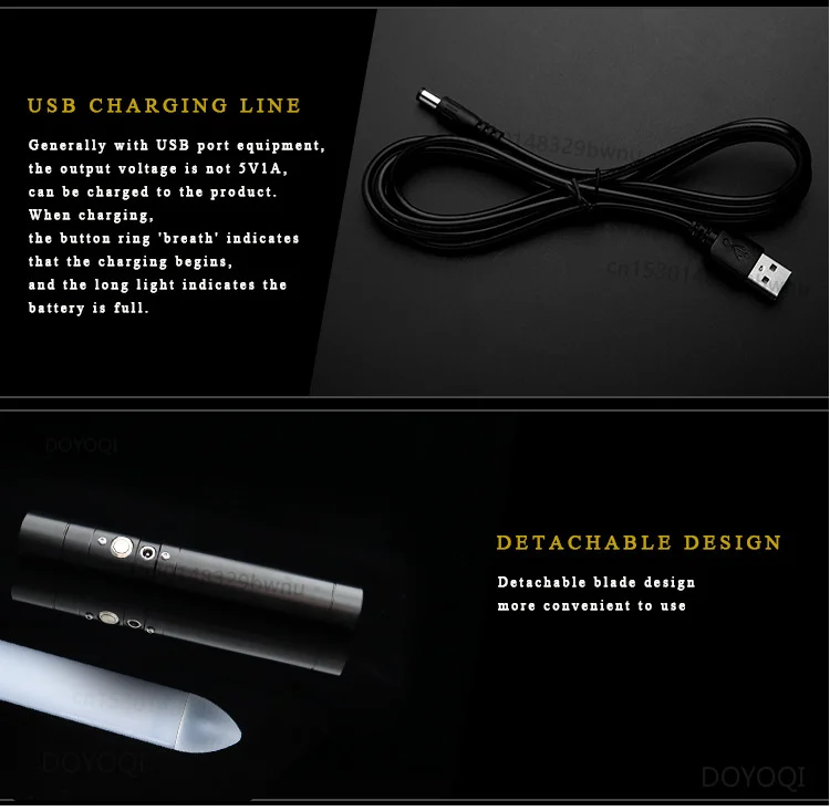 При зарядке: лезвие загорается, начинает зарядку и выключается при полном заряде. Время зарядки обычно составляет 2-3 часа, а время зарядки зависит от выбранной базы зарядки. 【 Это световой меч с полированным звуком. Основное лезвие может быть разобрано, а другие запрещено разбирать! 】