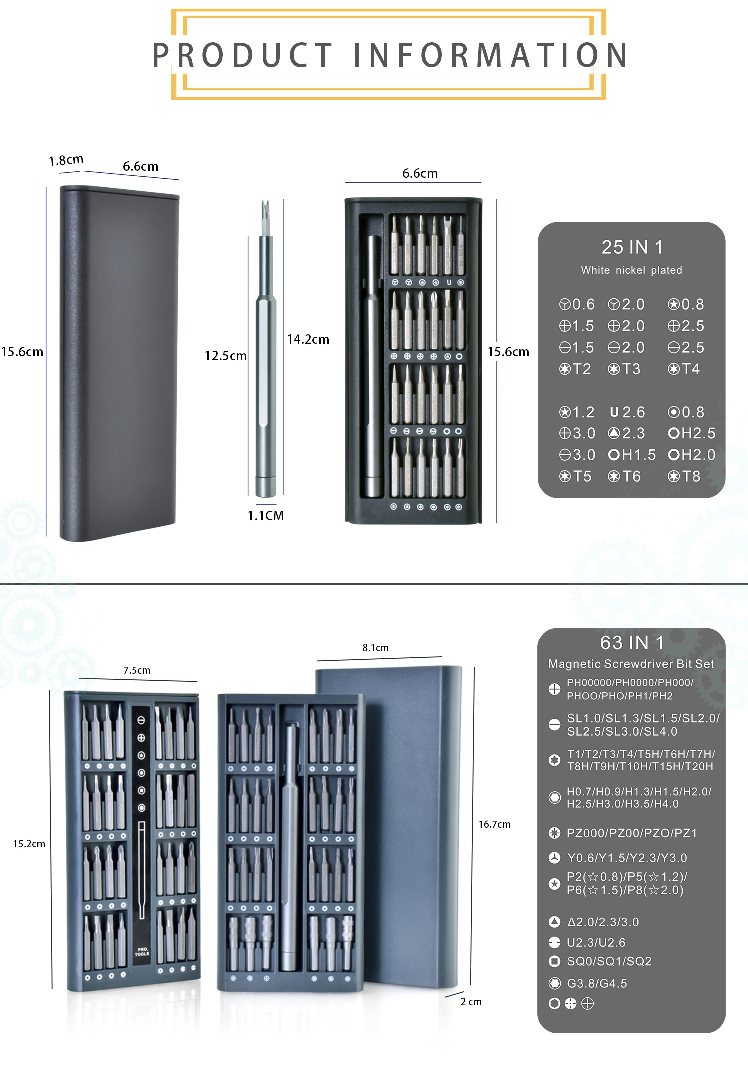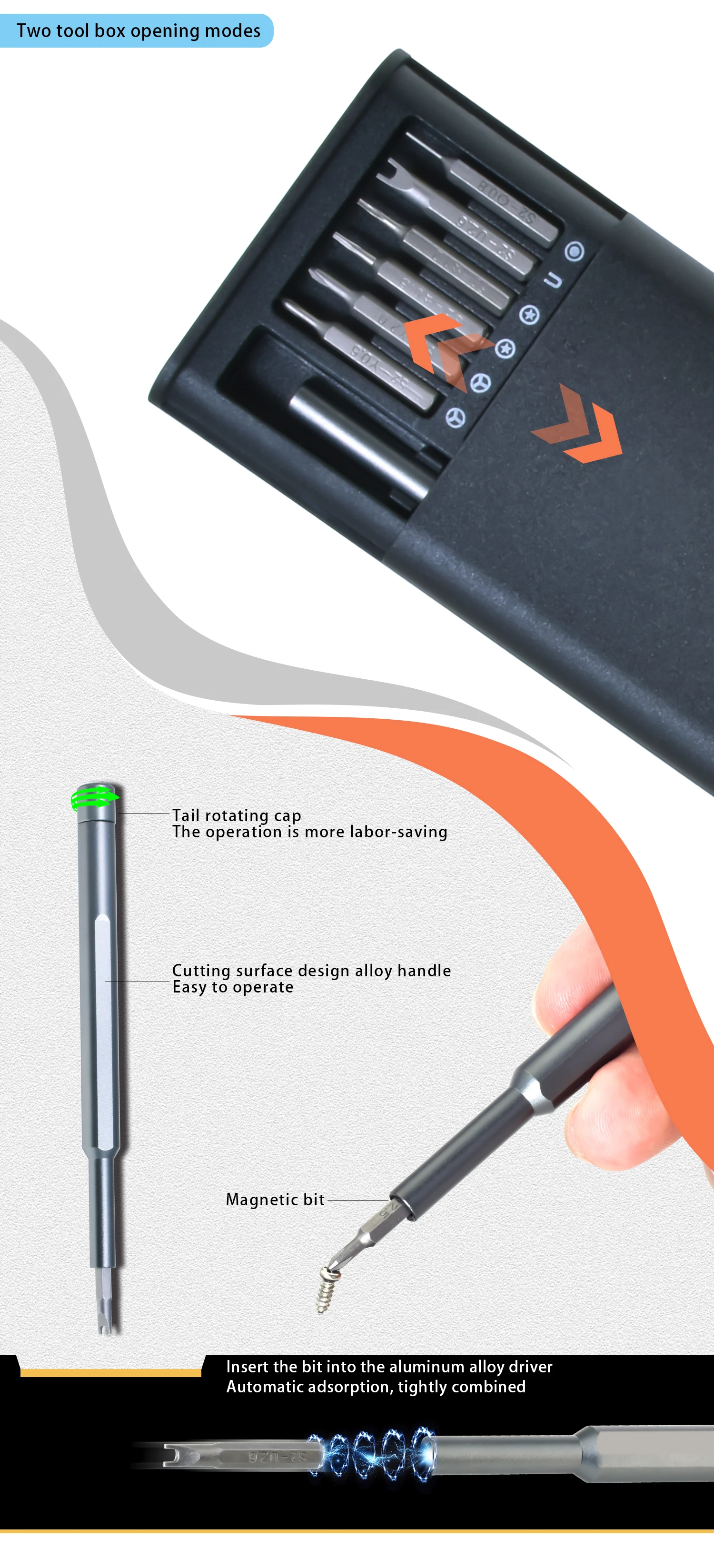 Антикоррозийная хромированная ванадиевая стальная ручка, магнитный ящик для хранения и направляющие головки.
