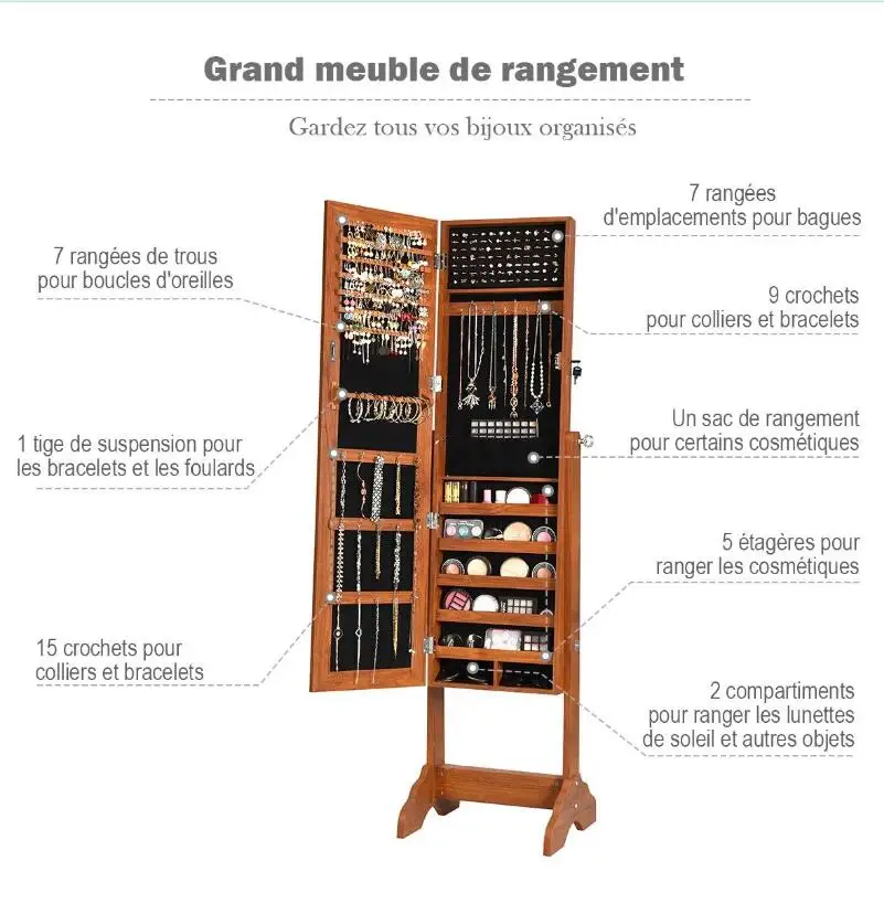 Ювелирный шкаф с большим зеркалом-прекрасный аксессуар. Он разработан специально, чтобы хранить ваши ценные вещи, особенно ваши ювелирные изделия, упорядоченно и предотвратить их запутывание. Зеркало и Наклонное положение на 3 уровнях практичны для примерки вашей одежды или украшений. Шикарный и Ретро дизайн шкафа делает его частью мебели совместимой с различными интерьерными украшениями. Он может быть заблокирован, чтобы обеспечить его содержание и будет полезен вам на ежедневной основе.
