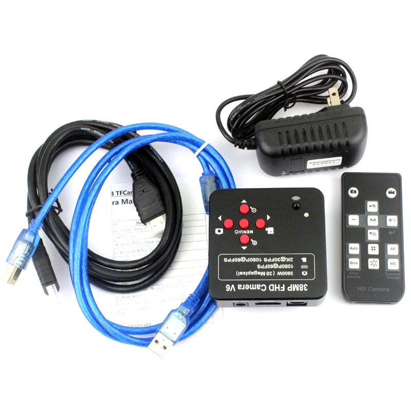 Посылка включает в себя: камеру, адаптер питания, пульт дистанционного управления, бумажное руководство, кабель HDMI, 16G TF карта памяти