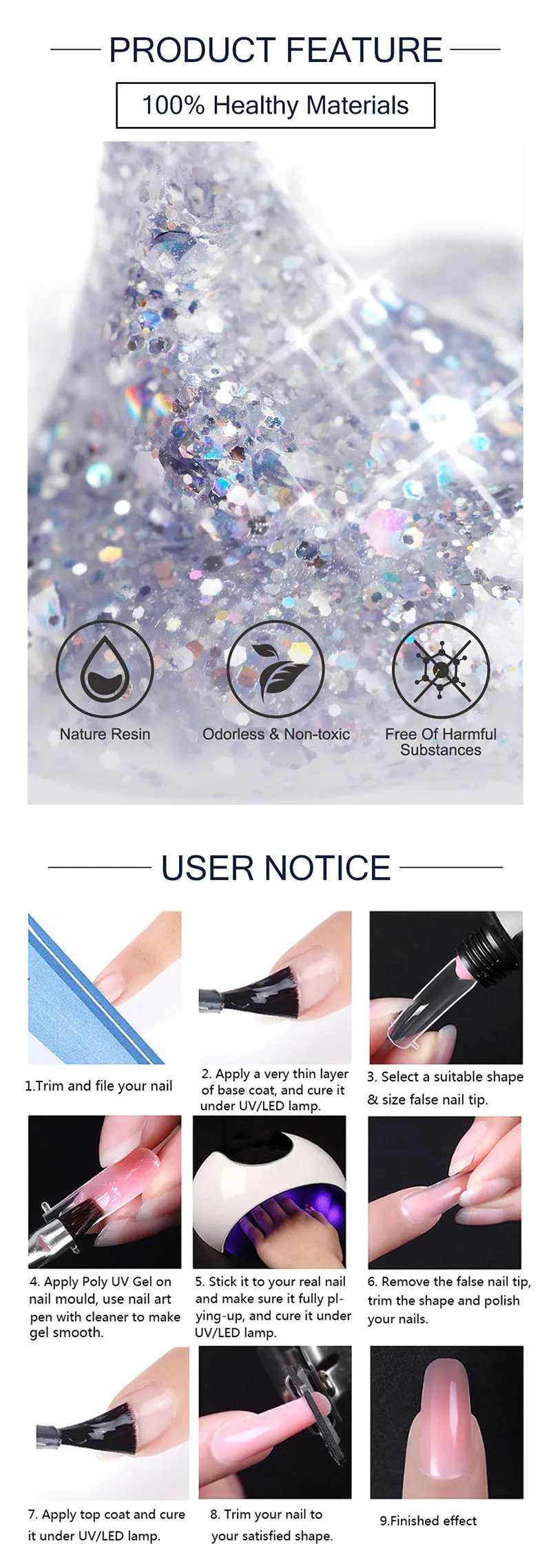 1. Этот поли гель для ногтей в наборе не имеет чипов или пятен и не будет легко отслаиваться. Срок службы около 2-3 недель с правильным применением.