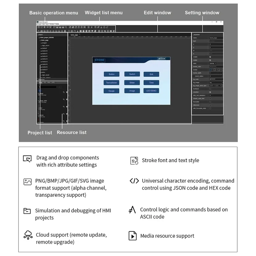 Для всех серий пользователи могут разработать проект HMI GUI с помощью бесплатного программного обеспечения STONE GUI, простые компоненты перетаскивания и простой json-код значительно уменьшат Рабочие нагрузки для разработки проекта.