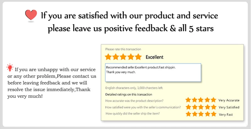 Мы всегда получаем положительные отзывы. Если вы хотите оставить отрицательный отзыв, пожалуйста, сначала свяжитесь со мной. Так что мы можем работать вместе, чтобы сделать это правильно для вас. И негативные отзывы действительно вредны для нашего продавца alibaba. Это повлияет на наши продажи, наш доход. Надеюсь, вы понимаете. Если вы согласны со всеми условиями, то, пожалуйста, не торопитесь, а также оставить хороший отзыв о нас и поставите 5 звезд в подробном рейтинге продавца к нам, которые имеют крайне важное значение для роста нашей небольшой компании.