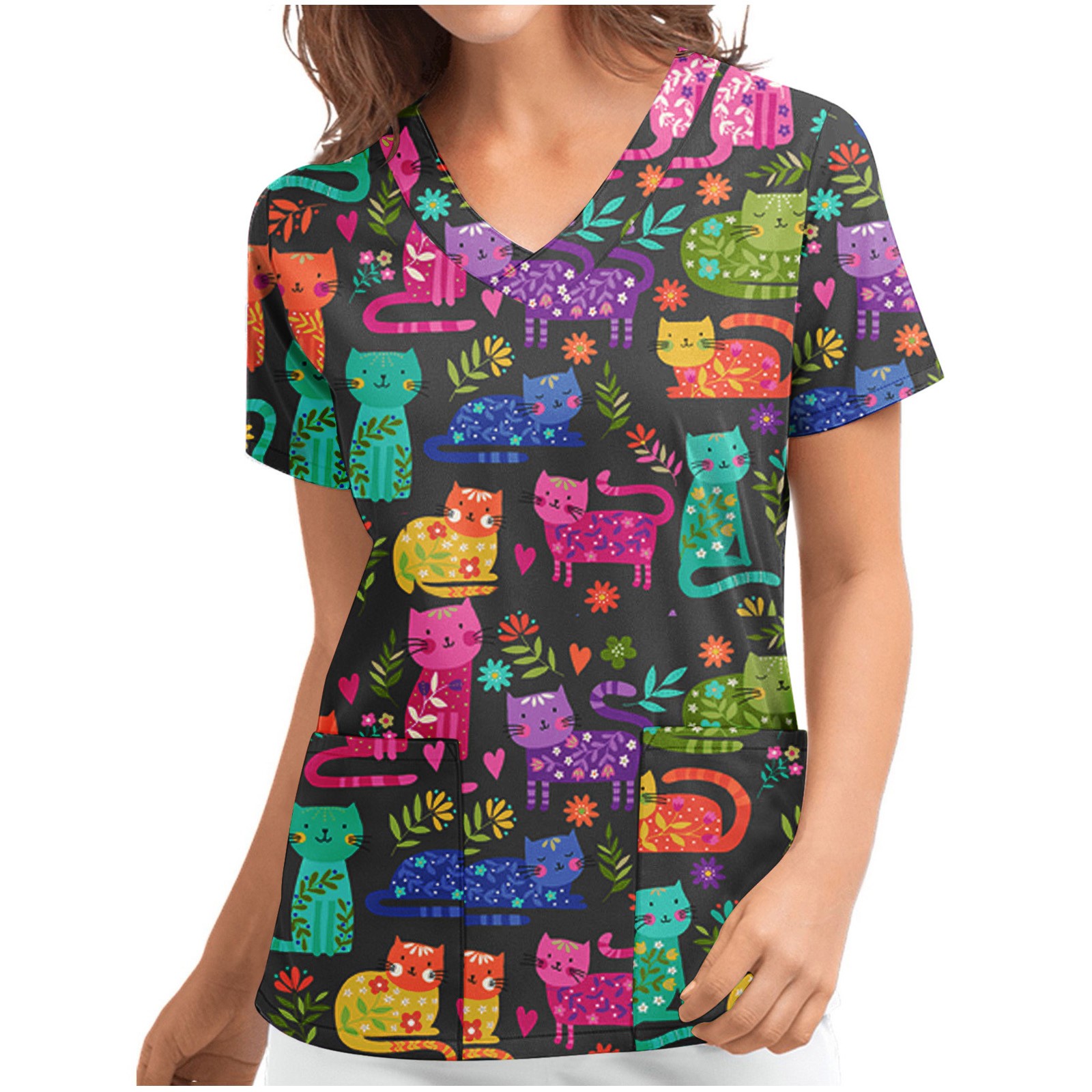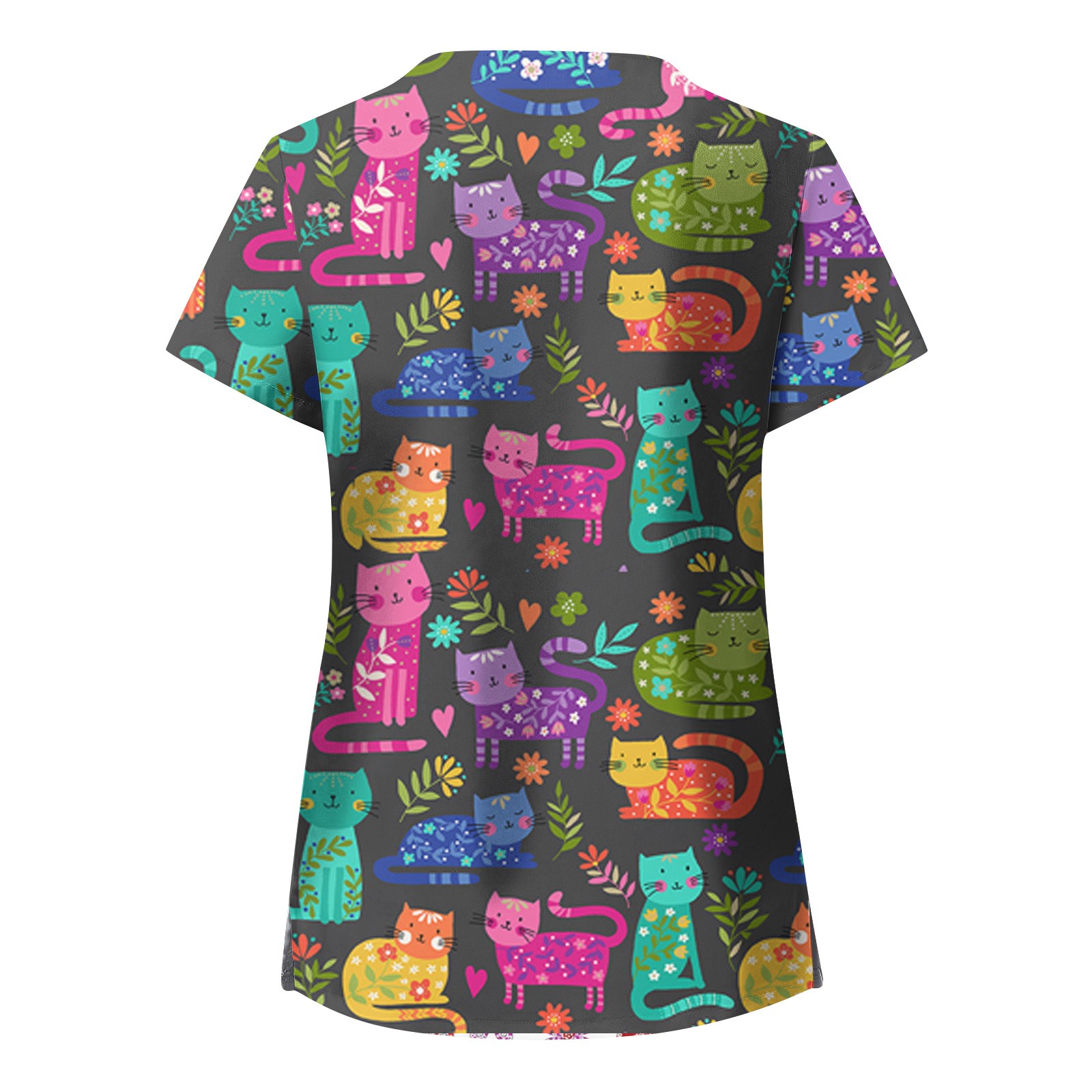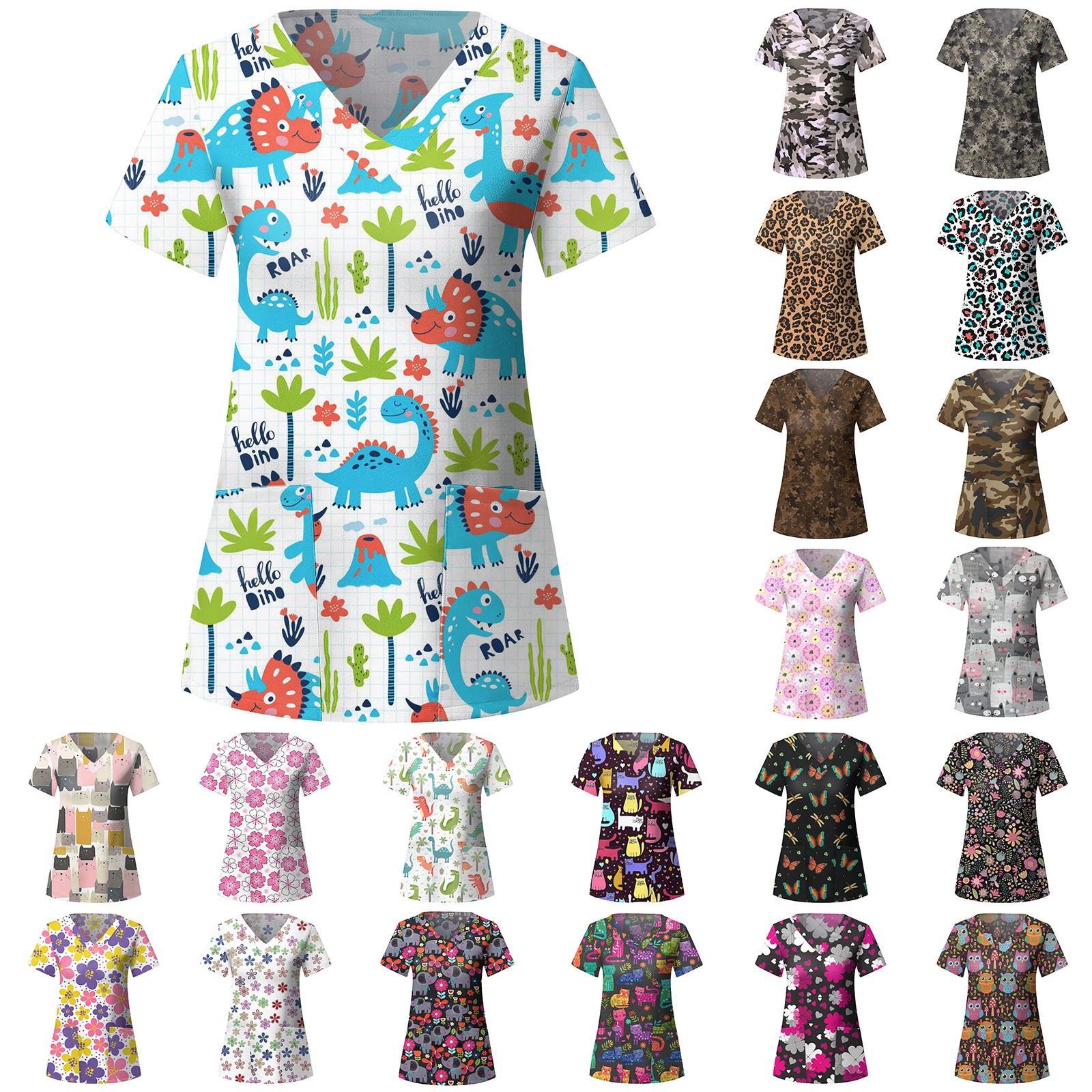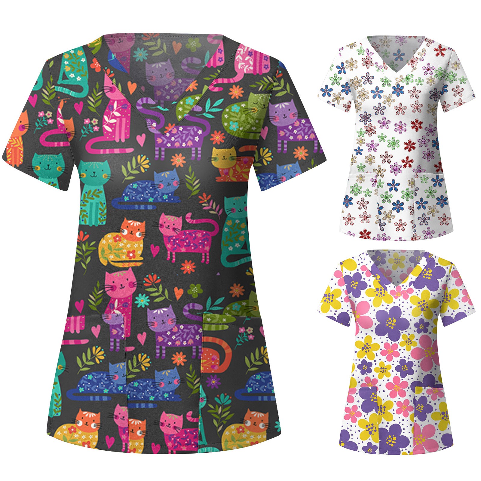 Женская униформа для медсестры размера плюс, Повседневная футболка с коротким рукавом и v-образным вырезом с мультяшным животным и цветочным принтом