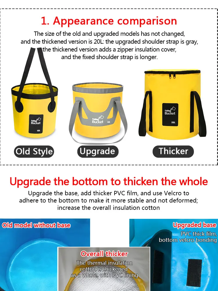 Многофункциональное складное ведро: это складное покрытое ведро очень подходит для кемпинга, рыбалки, путешествий, катания на лодках, походов, садоводства, пикников, активного отдыха, ежедневного использования и мытья автомобиля. Его можно использовать в качестве ведра для рыбы, ведра для льда, корзины для овощей и фруктов, бассейна для путешествий, ковша для бейсбола и т. Д. Это также Евангелие для пожилых людей. Это термоизоляционный поднос.