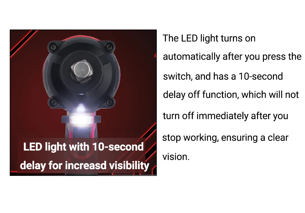 -Переменная скорость и яркий светодиодный светильник-С помощью триггера переменной скорости вы можете легко контролировать скорость вашего гаечного ключа от 0-3200 об/мин. Яркий светодиодный светильник улучшит видимость в темных рабочих местах.