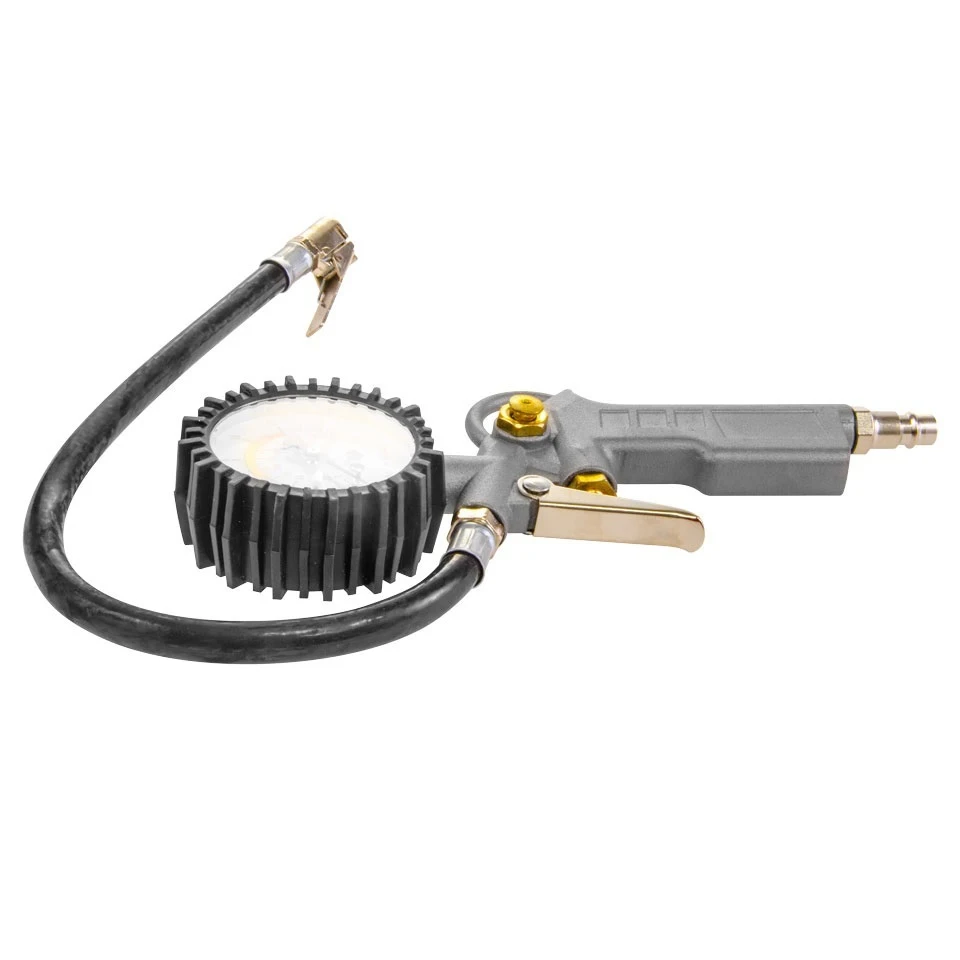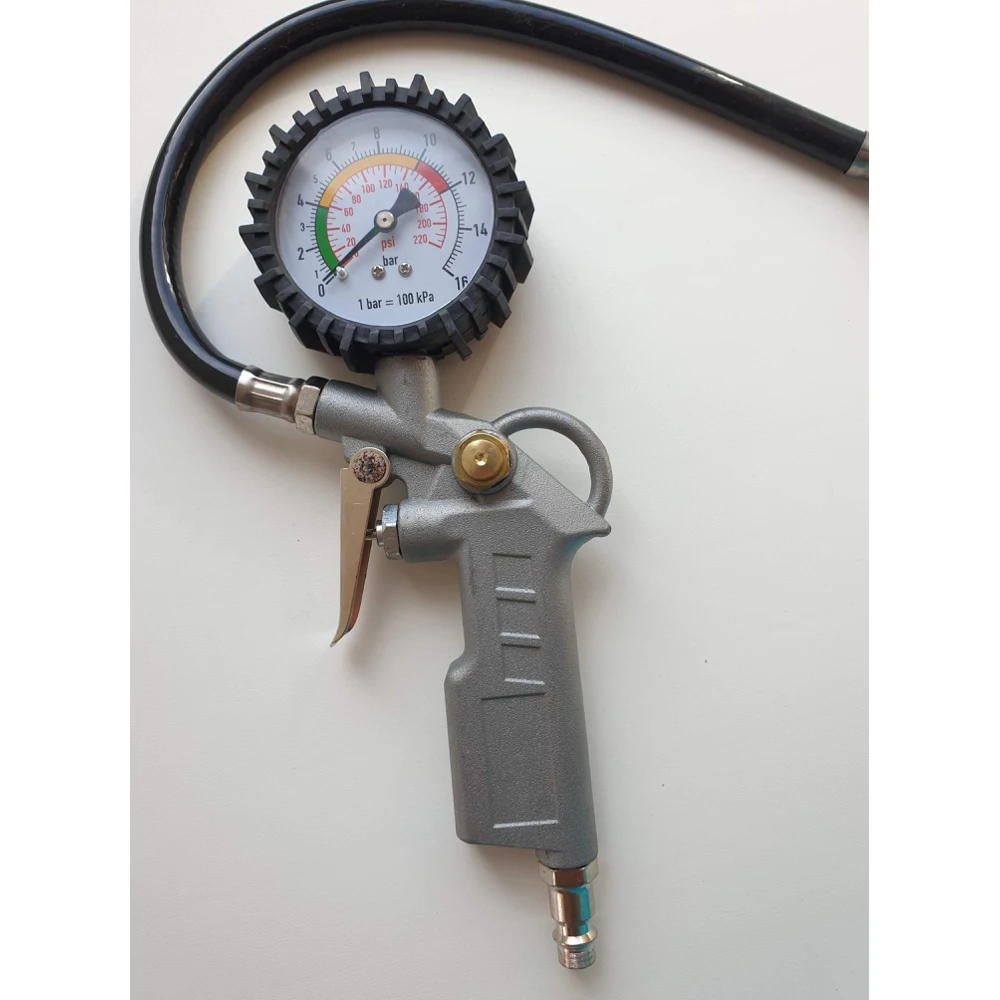 The gun with pressure gauge is used to control the pressure and pump the car tires. Has a protective rubber cover from mechanical damage. Equipped with a quick-release connection.