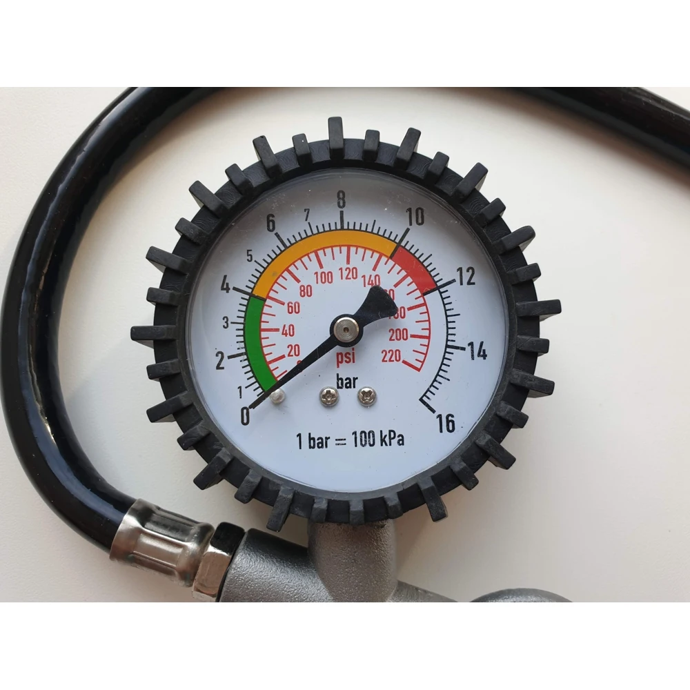 The gun is equipped with membrane type manometers with a scale in the physical quantities of PSI and bar, as well as with a conditional scale with colored areas. gases). Can be used to control the tire pressure of cars. The gauge is protected from mechanical damage by a rubber cover.
