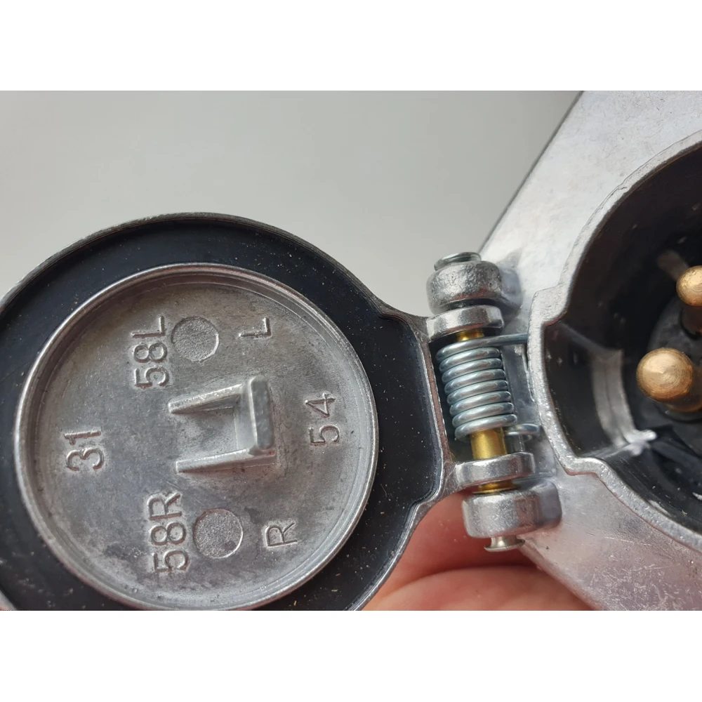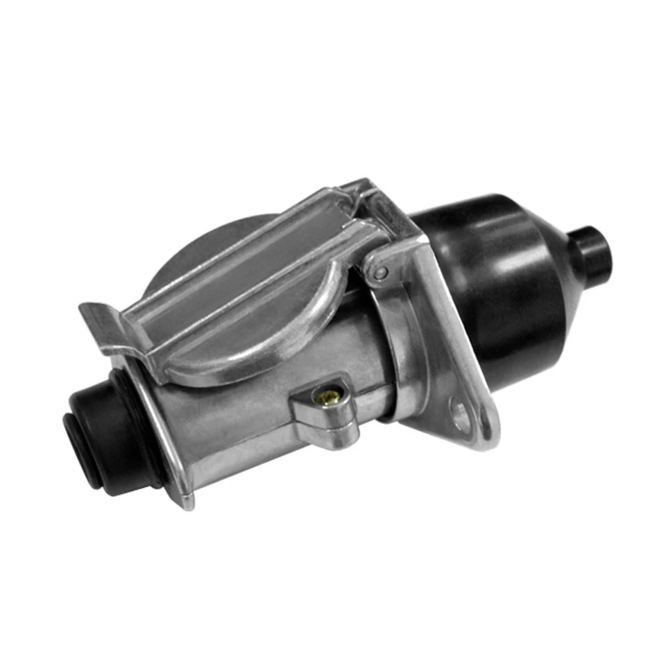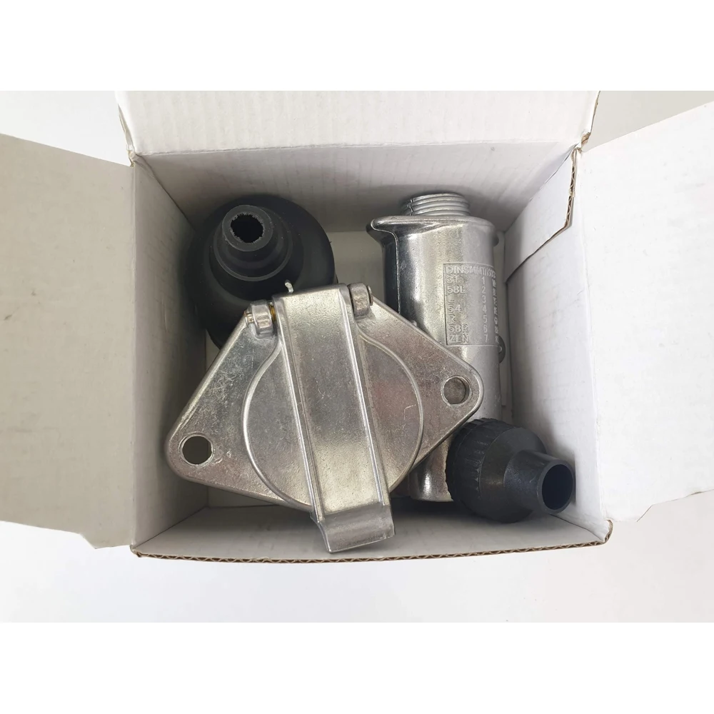 The electrical n-type connector is used to connect the electrical equipment of the vehicle-tractor with the trailer. Consists of a plug and socket (7 pin). 6 pins with one diameter and 1 pin with big size. The body of the product is made of aluminum alloy resistant to aggressive environment. The plug consists of two trunks connected by bolts. The socket has a cover on the spring. Inside it, a O-ring is located to protect the contacts, preventing moisture and dust from entering the contacts at open state. Also on the lid of the outlet there is a retainer, which prevents the electrical circuit from washing during operation. It is mounted on an electric cable and fixed with wires to contacts with bolts. The output of the wire is protected from dust and moisture from rubber pollen. OEM: 0015450626; 179529 + 179530. Analog: Febi 07342 + 07343; diesel Technic 4.60115 + 4.60116 material: aluminum, plastic, rubber.