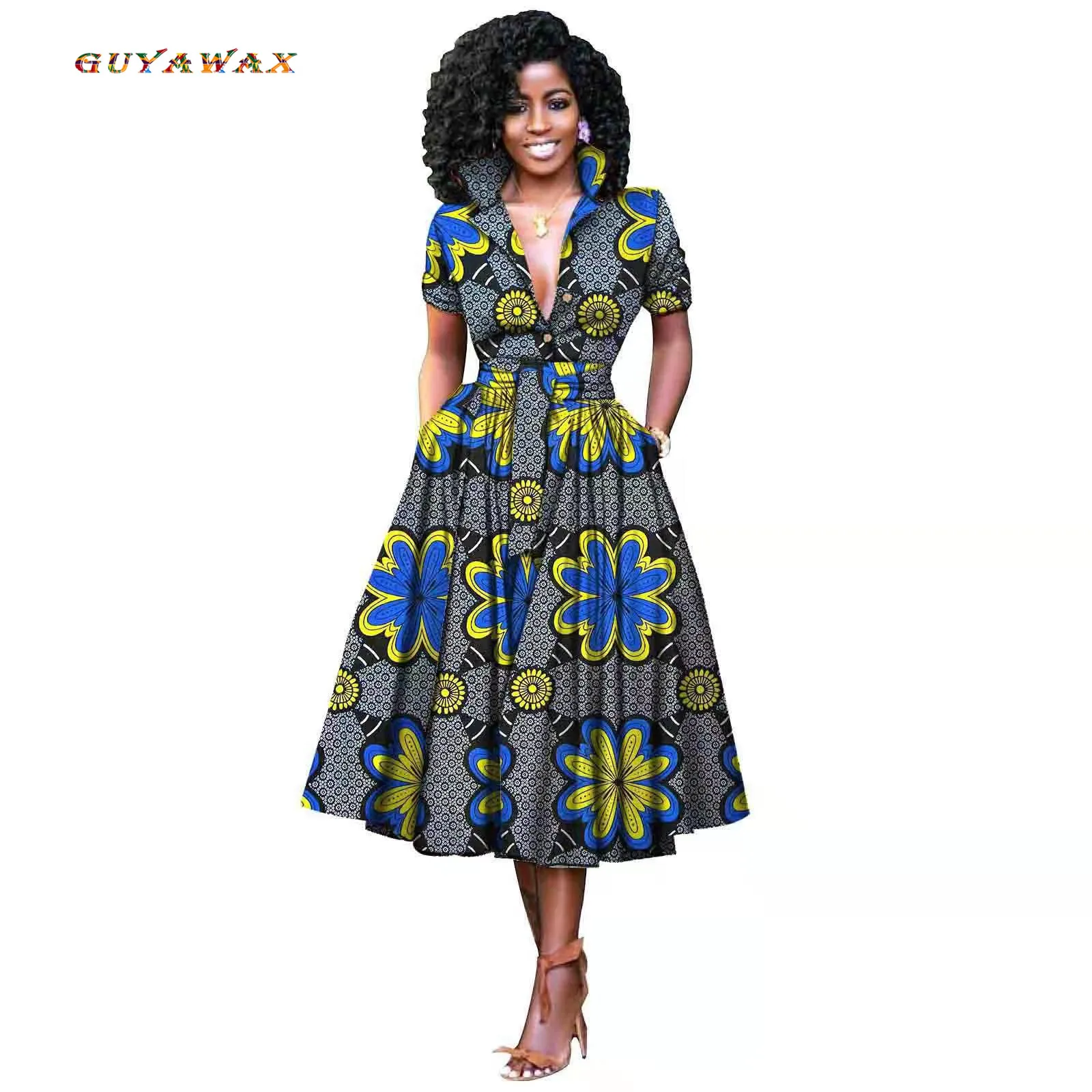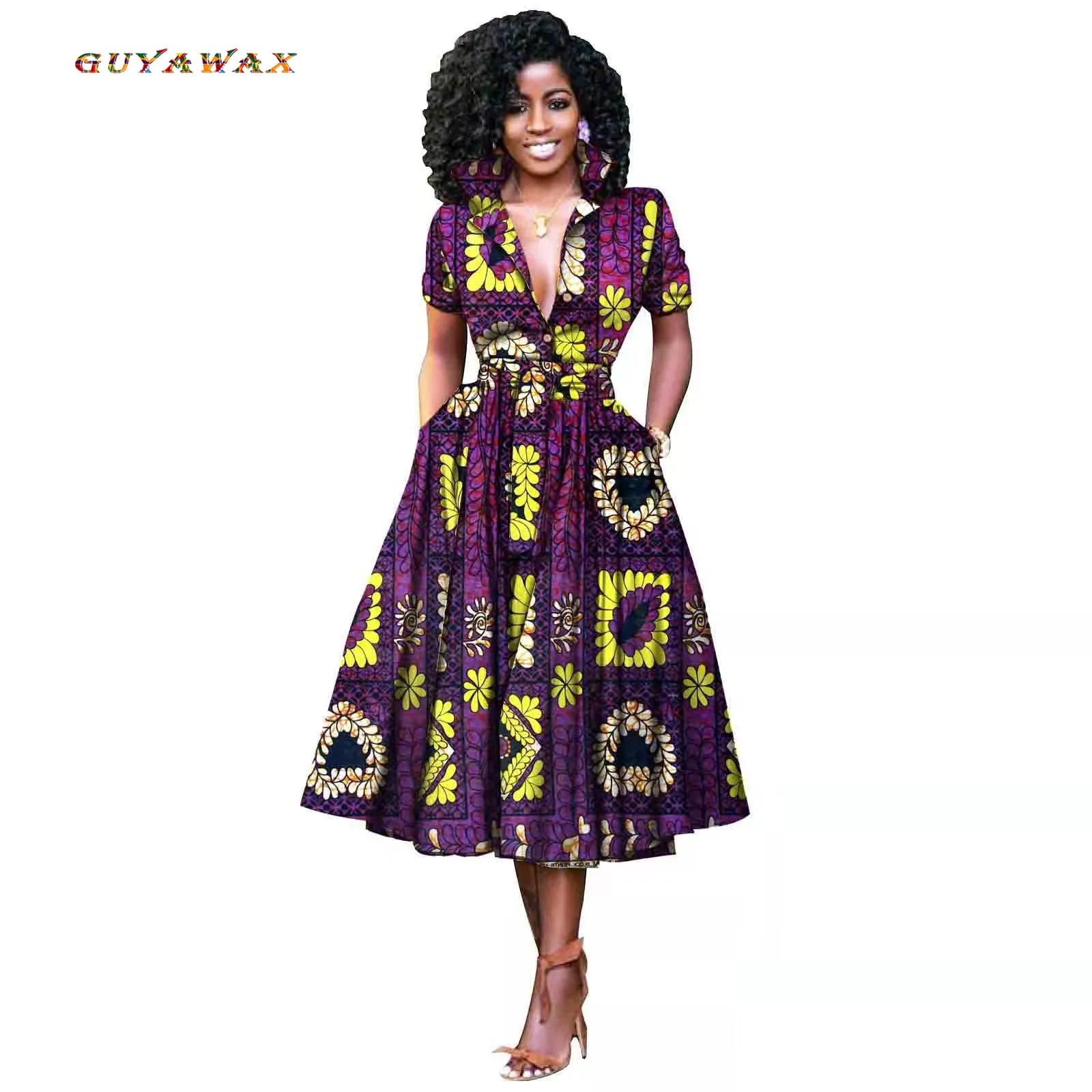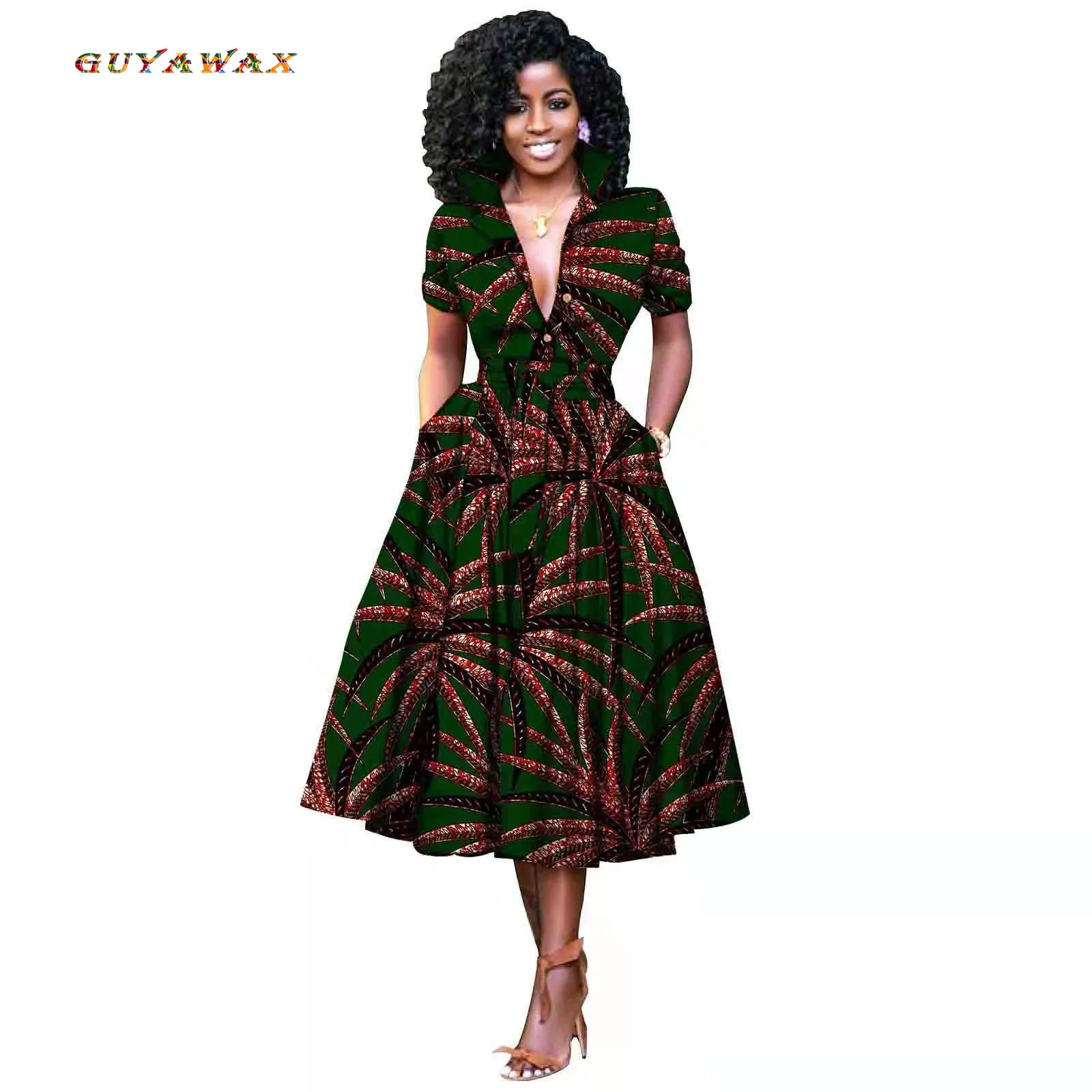 Африканские платья для женщин, короткий рукав, v-образный вырез, высокая талия, ткань Анкары, официальное платье с принтом, чистый хлопок, Bazin Riche, платье S2025072