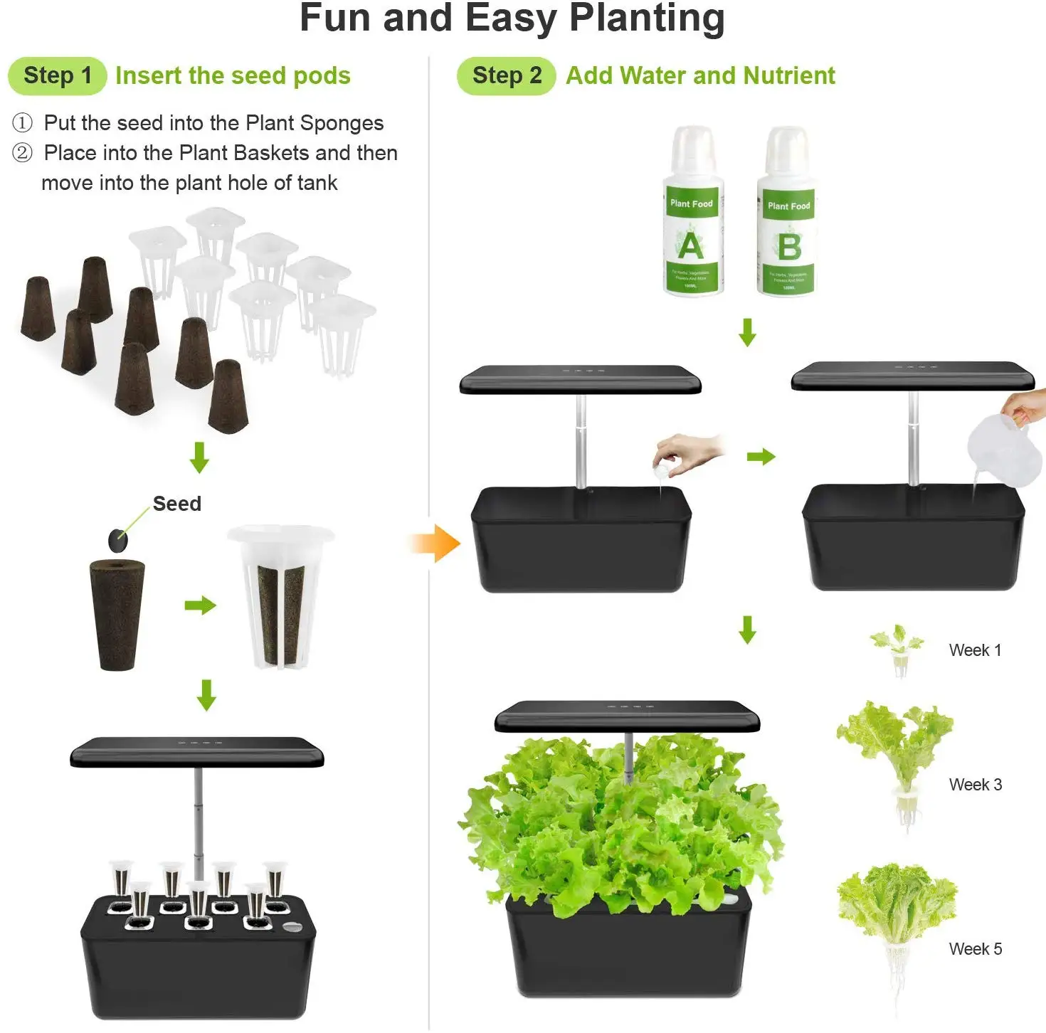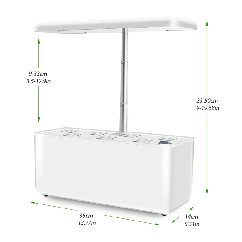 5. Садовый набор с регулируемой высотой: светильник с верхней частью гидропонной системы посадки можно регулировать, чтобы адаптироваться к овощам на разных этапах роста, тем самым помогая овощам поглощать энергию светодиодный светильник и способствовать росту. С включенными 7 стручками, вы можете вырасти до 7 растений до 13,4 дюймов в высоту одновременно.