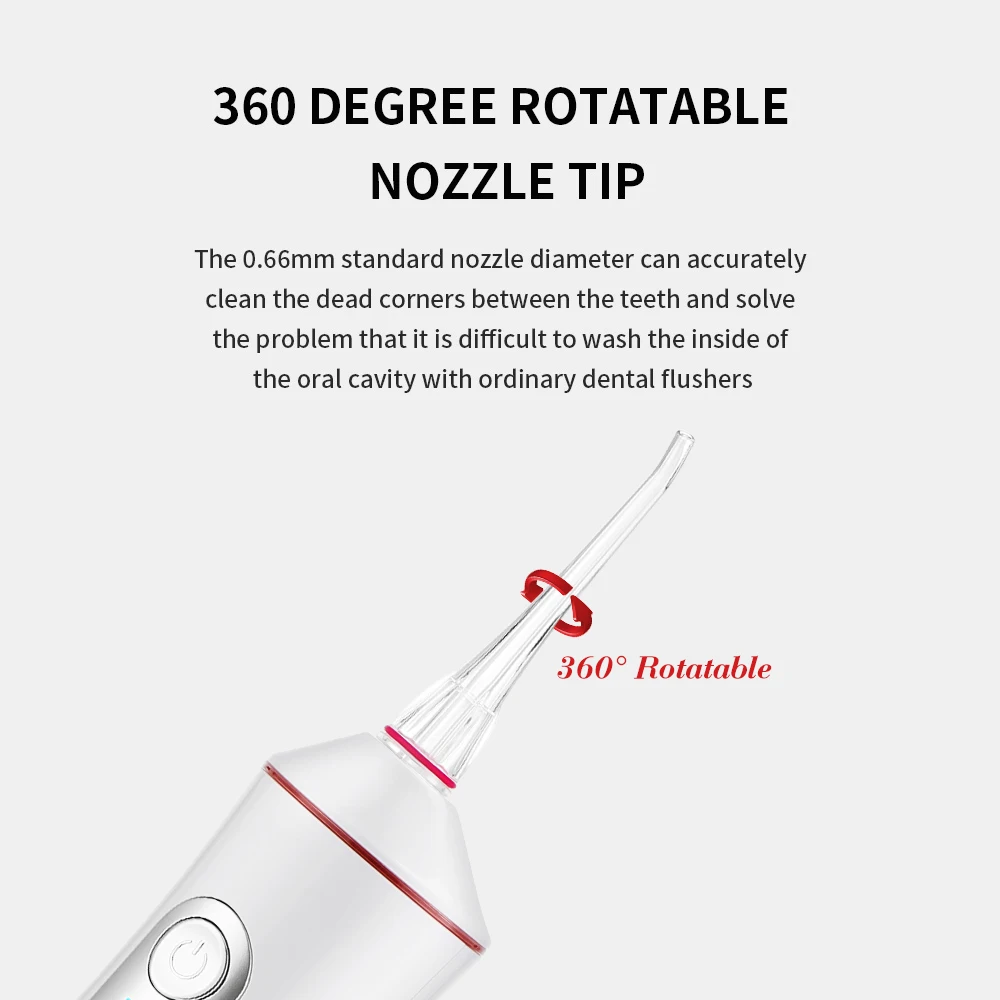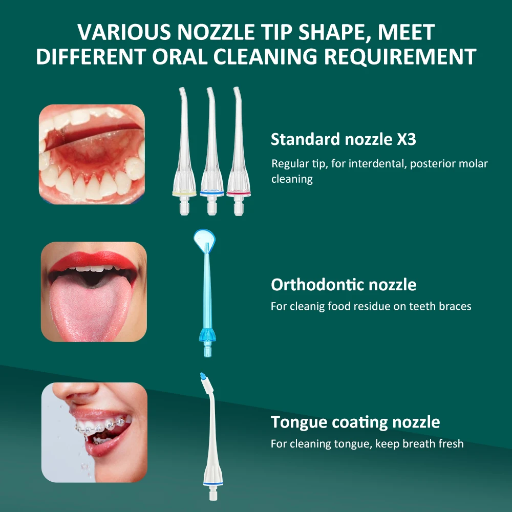 3. 5 replaceable nozzles, food-grade standard materials, safe and environmentally friendly, 360° rotatable, multi-directional cleaning of the mouth.