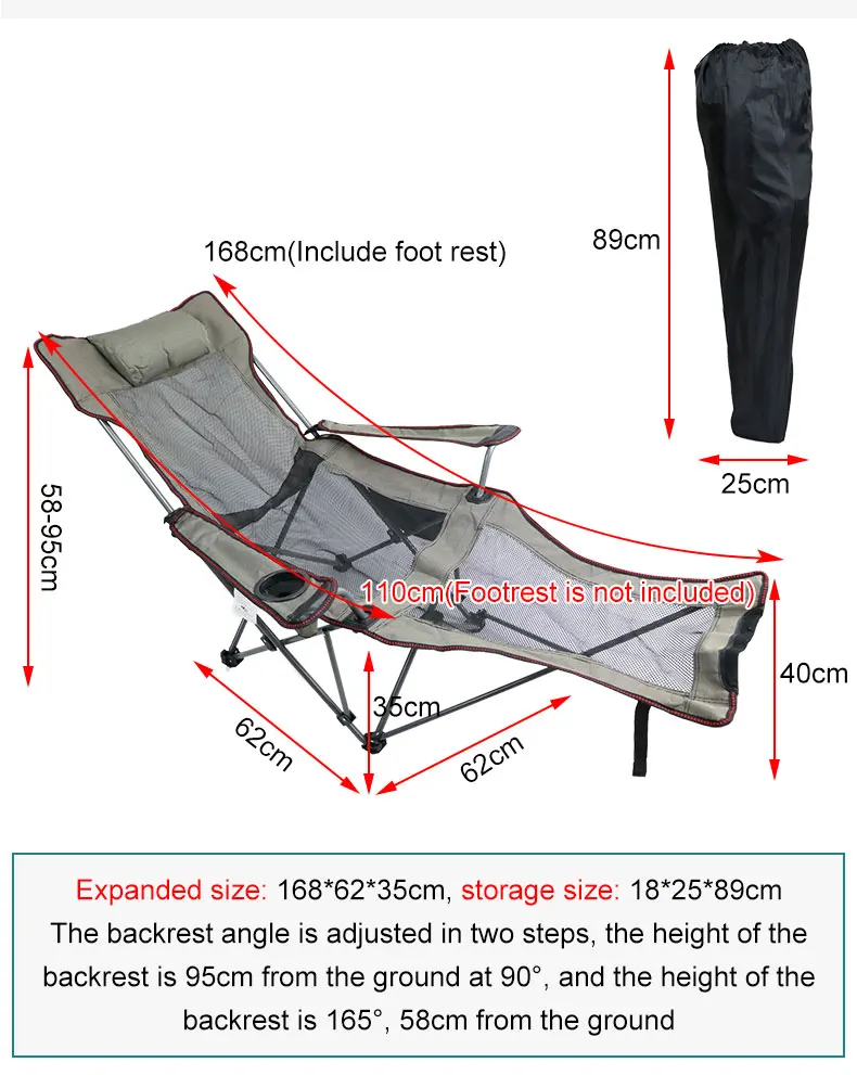Угол спинки регулируется двумя шагами, высота спинки 95 см от земли при 90 °, а высота спинки 165 °, 58 см от земли