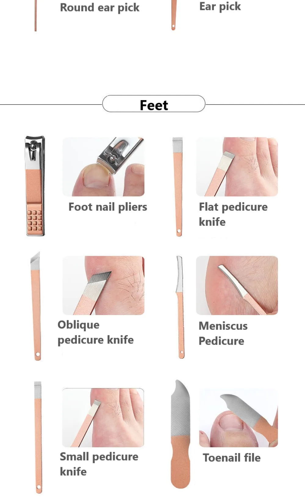 1. Это маникюрный набор, который отвечает потребностям ежедневного использования. Он содержит множество практичных аксессуаров: кусачки для ногтей, диагональные ножницы, ножницы для ногтей olecranon, ножницы для ухода за лицом, пилочки для ногтей, пинцеты для бровей, больные иглы, клипсы для ушей.