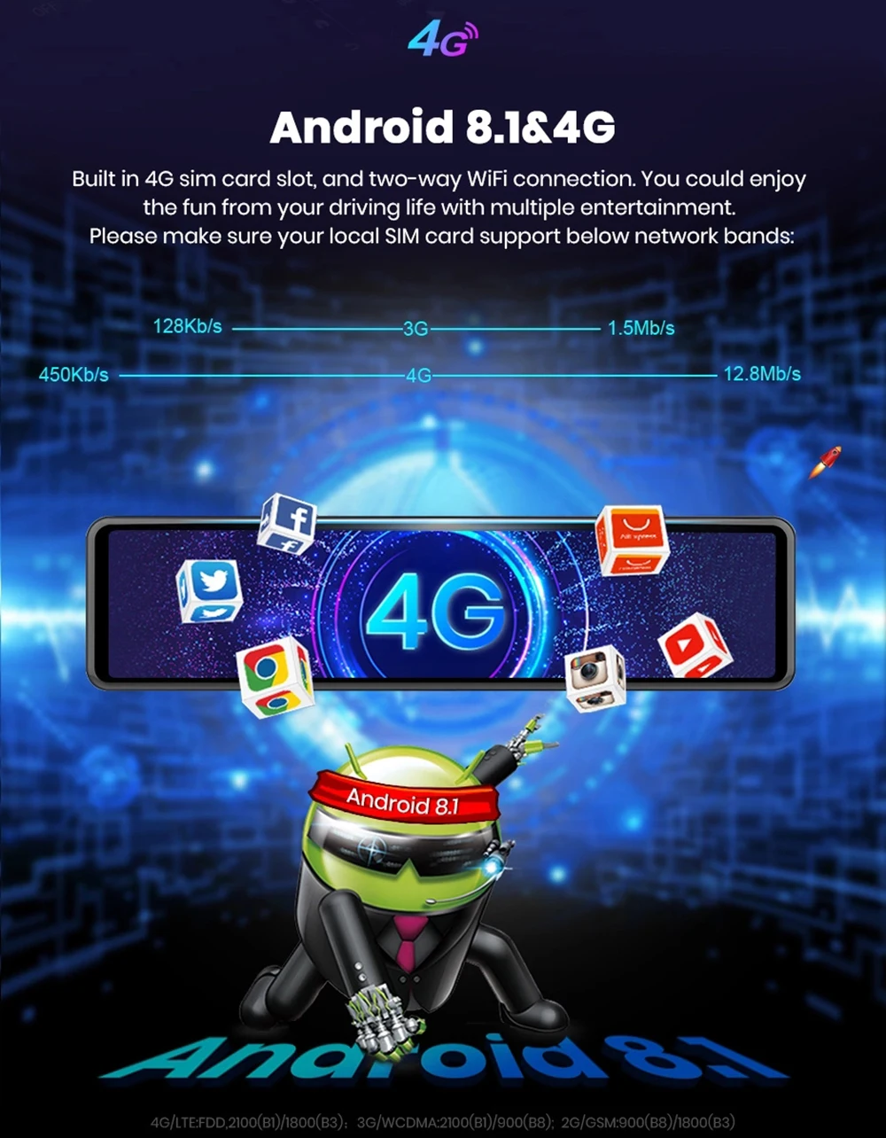 Встроенный слот для sim-карты 4G и двустороннее подключение к Wi-Fi, вы можете наслаждаться удовольствием от вашей жизни вождения с множеством развлечений. Пожалуйста, убедитесь, что ваша местная sim-карта поддерживает следующие сетевые полосы.