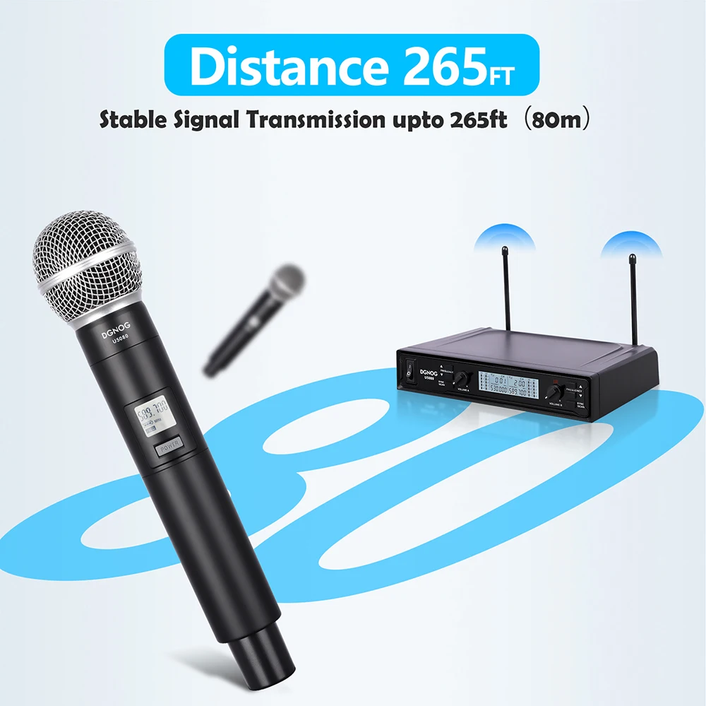 【Улучшенная стабильность сигнала】-С 100 регулируемыми частотами на UHF канал, всего 200 частот, Дальний диапазон передачи 265ft (80 м) в открытом пространстве, обеспечение одновременного использования до 10 наборов, не беспокоясь о помехах.