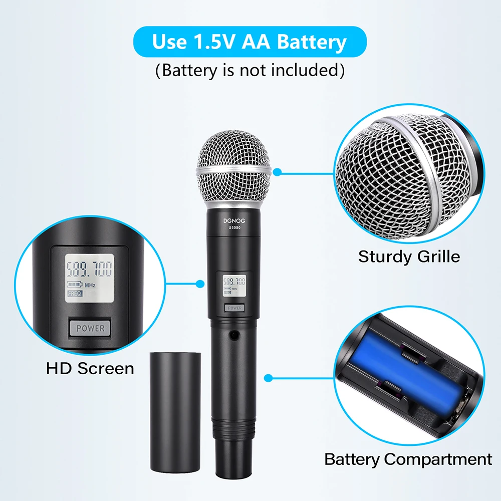 【Простота в эксплуатации】-Просто включите приемник и микрофоны, они будут совпадать автоматически. Примечание: он не совместим с ноутбуком, IPad, мобильным телефоном и av-ресивером. Для каждого микрофона требуется 2 батарейки типа АА (не входят в комплект).