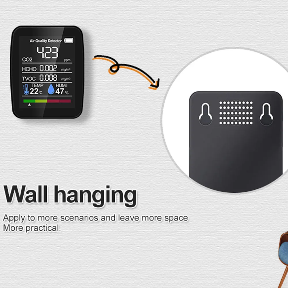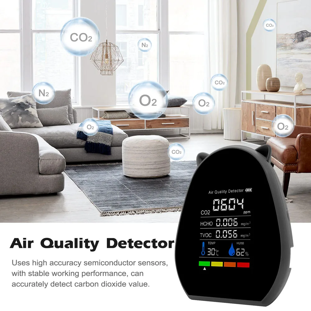 Большой ЖК-дисплей с подсветкой, вы можете видеть количество электроэнергии, значение CO2, значение TVOC, значение HCHO, температуру и влажность четко.