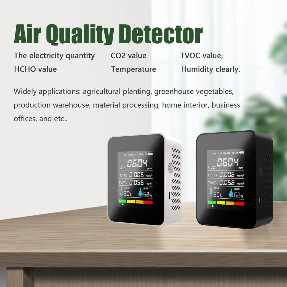 Это своего рода качественный детектор качества воздуха, компактный размер, легкий и портативный. Принимает высокоточные полупроводниковые датчики TVOC, обнаружение в реальном времени, автоматическое обновление данных, с мульти-использованием. Большой ЖК-дисплей, вы можете видеть количество электроэнергии, значение CO2, значение TVOC, значение HCHO, температуру и влажность четко. Широкое применение: сельскохозяйственная посадка, тепличные овощи, производственный склад, обработка материалов, домашний интерьер, офисы и т. д.