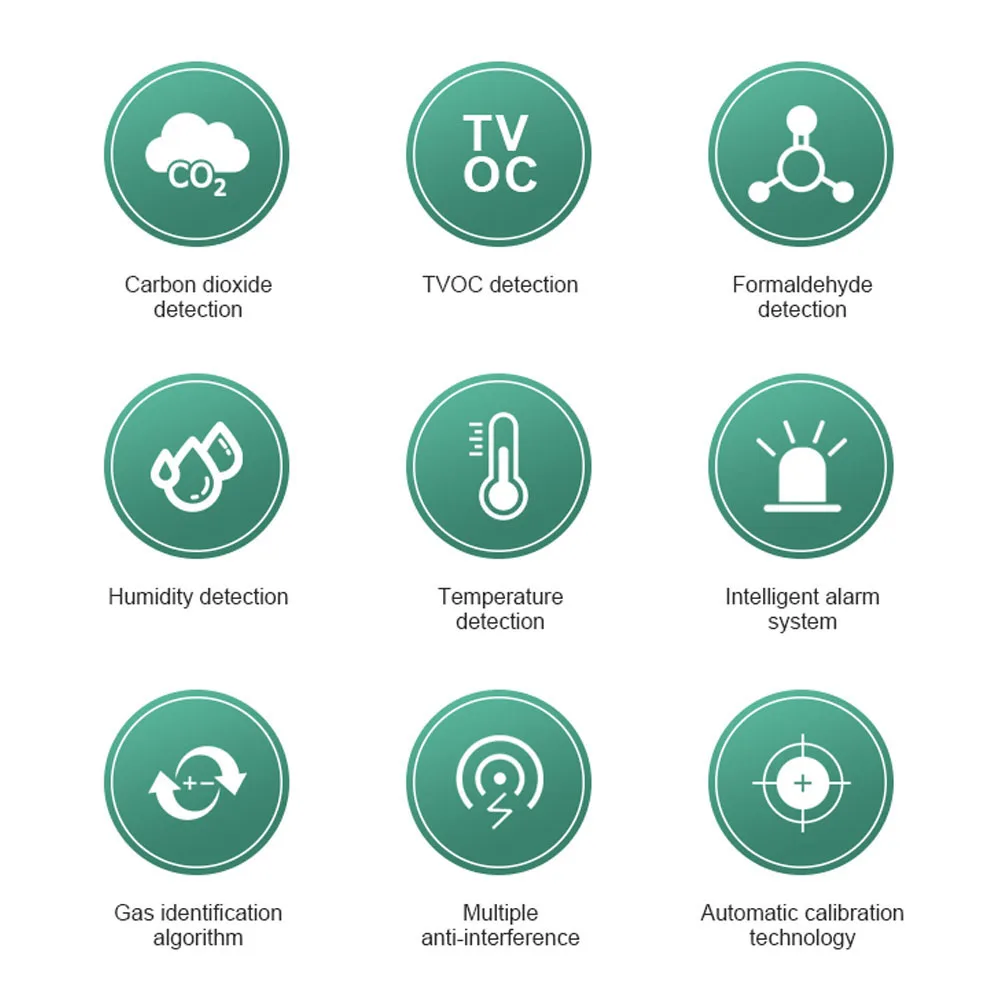 Большой ЖК-дисплей с подсветкой, вы можете видеть количество электроэнергии, значение CO2, значение TVOC, значение формальдегида, температуру и влажность четко.