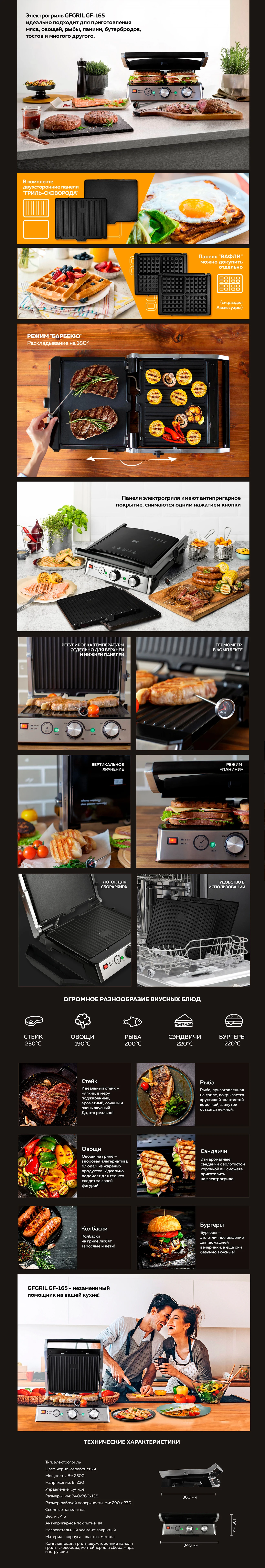 Электрический гриль GFGRIL GF-165 со съемными двусторонними панелями, термометр для определения степени прожарки, инструкция