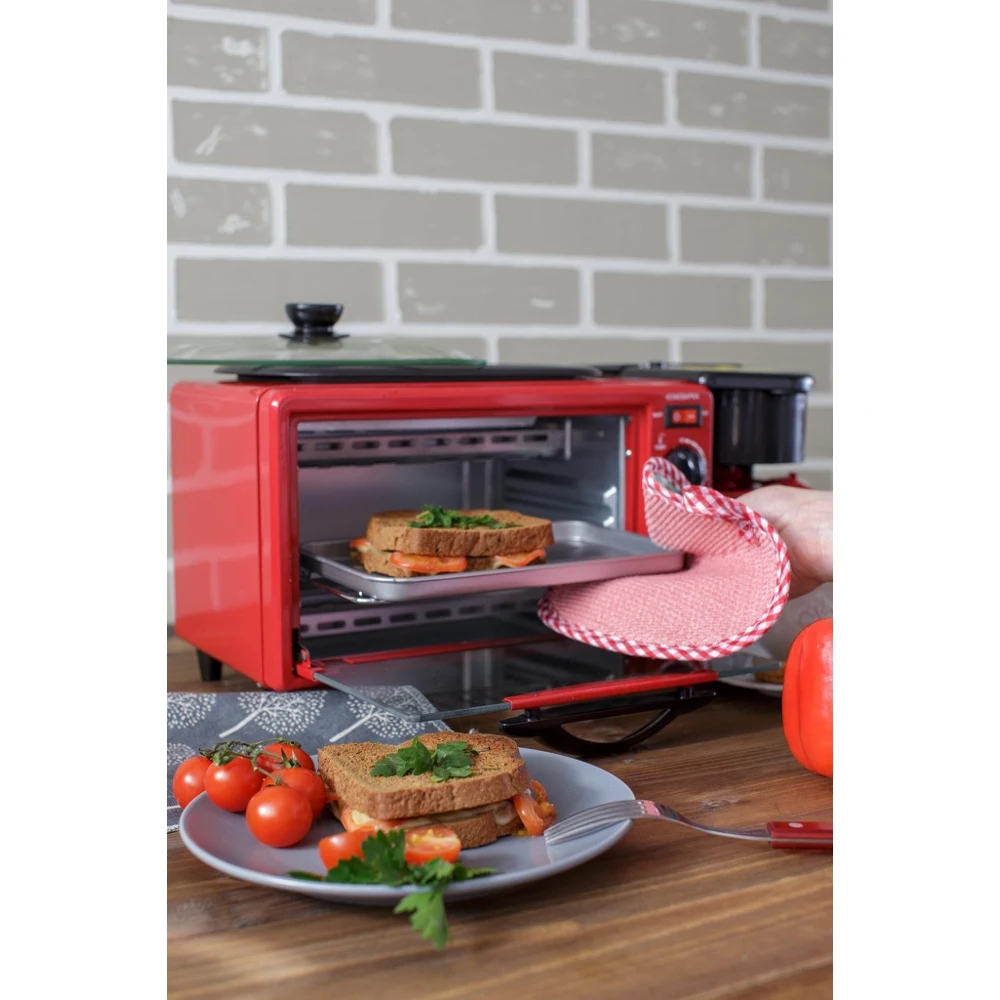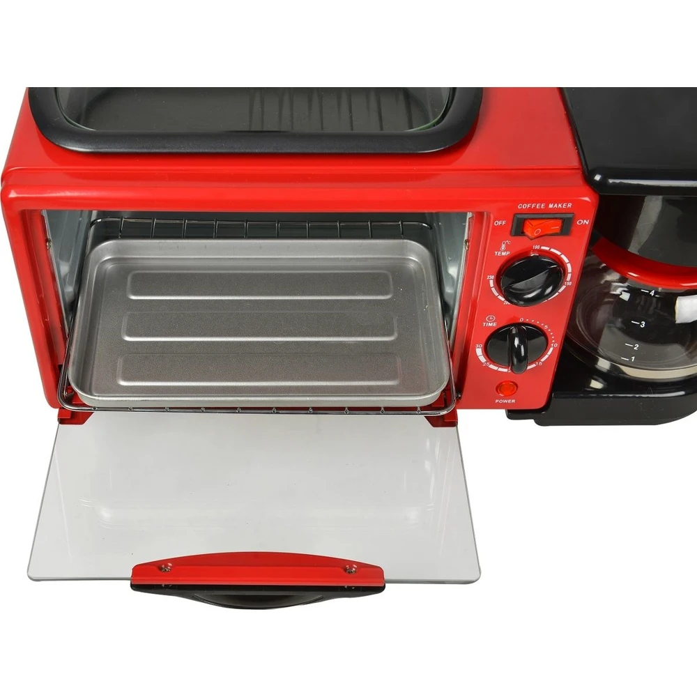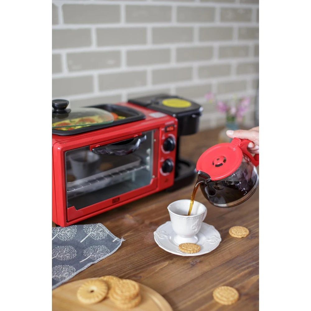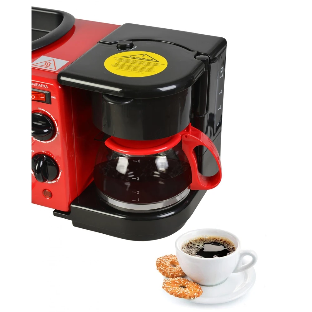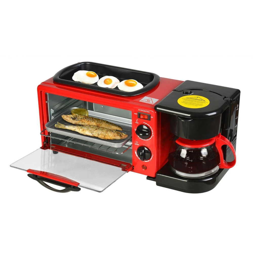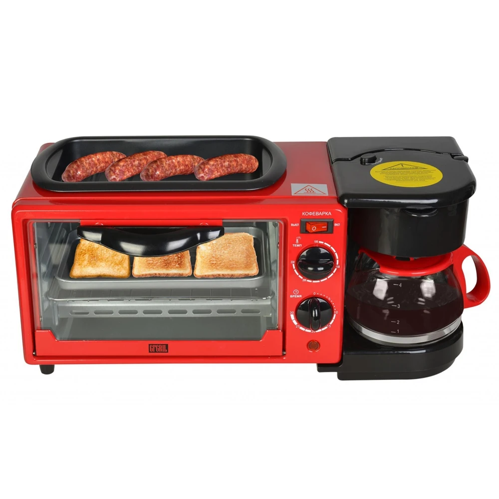 Кофеварка+Духовка+Гриль 3 в 1. GFBB-7 Breakfast Bar - электрическая многофункциональная мини-печь идеально совмещает в себе функции кофеварки, духовки и гриля и пригодится всем, кто не хочет тратить много времени на приготовление пищи, но при этом хочет питаться вкусно и полезно. Этот кухонный прибор позволяет сделать горячий изысканный завтрак за считанные минуты. Все в одном устройстве! Используйте мини духовку как тостер для поджаривания хлеба, тостов, булочек, рогаликов, горячих бутербродов, а гриль-противень для приготовления вкусной яичницы с беконом, блинчиков или сырников. Ваш ароматный кофе быстро приготовиться в капельной кофеварке и сохранит тепло до начала завтрака. Простые блюда будут готовы в течение нескольких минут! Кухонный прибор 3в1 идеален для молодой семьи, для студентов и для использования на даче. Компактный размер и совмещение сразу трех электроприборов создает идеальную альтернативу для более удобного размещения на кухне. Устройство 3в1 экономит время готовки, а также дает возможность приготовления полезной и вкусной пищи не только на завтрак, но и на обед и ужин. Встроенная кофеварка капельного типа, может приготовить до 4-х чашек ароматного кофе и даже травяной чай. Духовка идеально подходит для приготовления блюд на семью из 3-х человек, она оснащена 30-ти минутным таймером с автоматическим отключением, и регулятором температуры. Многофункциональная духовка, объём которой составляет 7 литров, позволяет запекать мясо и рыбу, печь пироги. Благодаря двустороннему нагреву сверху и снизу блюда равномерно пропекаются, быстро готовятся. Гриль-сковорода предназначена для поджаривания сосисок, овощей, может работать одновременно с духовкой, чтобы владелец мог побыстрее приготовить себе полноценный обед. Гриль-сковорода оснащена съемным противнем с антипригарным покрытием, что способствует быстрой чистке. Работает от сети 220В. Мощность в зависимости от включения функций 1050-1250 Вт. Объем духовки – 7 л. Объем чаши для кофе – 600 мл. Размеры сковороды: Длина – 26 см, Ширина – 15,5 см.