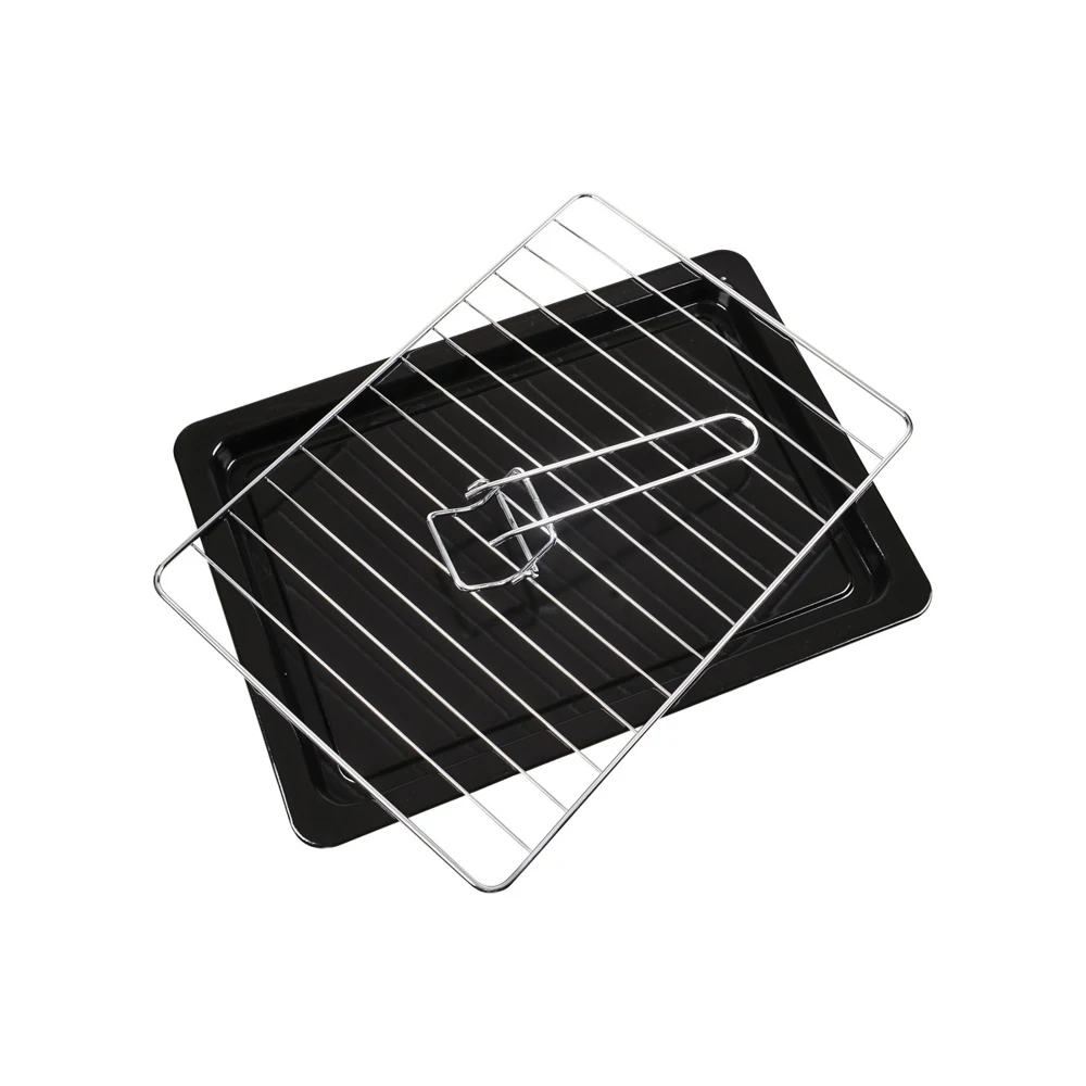 Мини-печь поставляется с противнем, металлической решеткой и зажимом для безопасного и лёгкого вынимания.