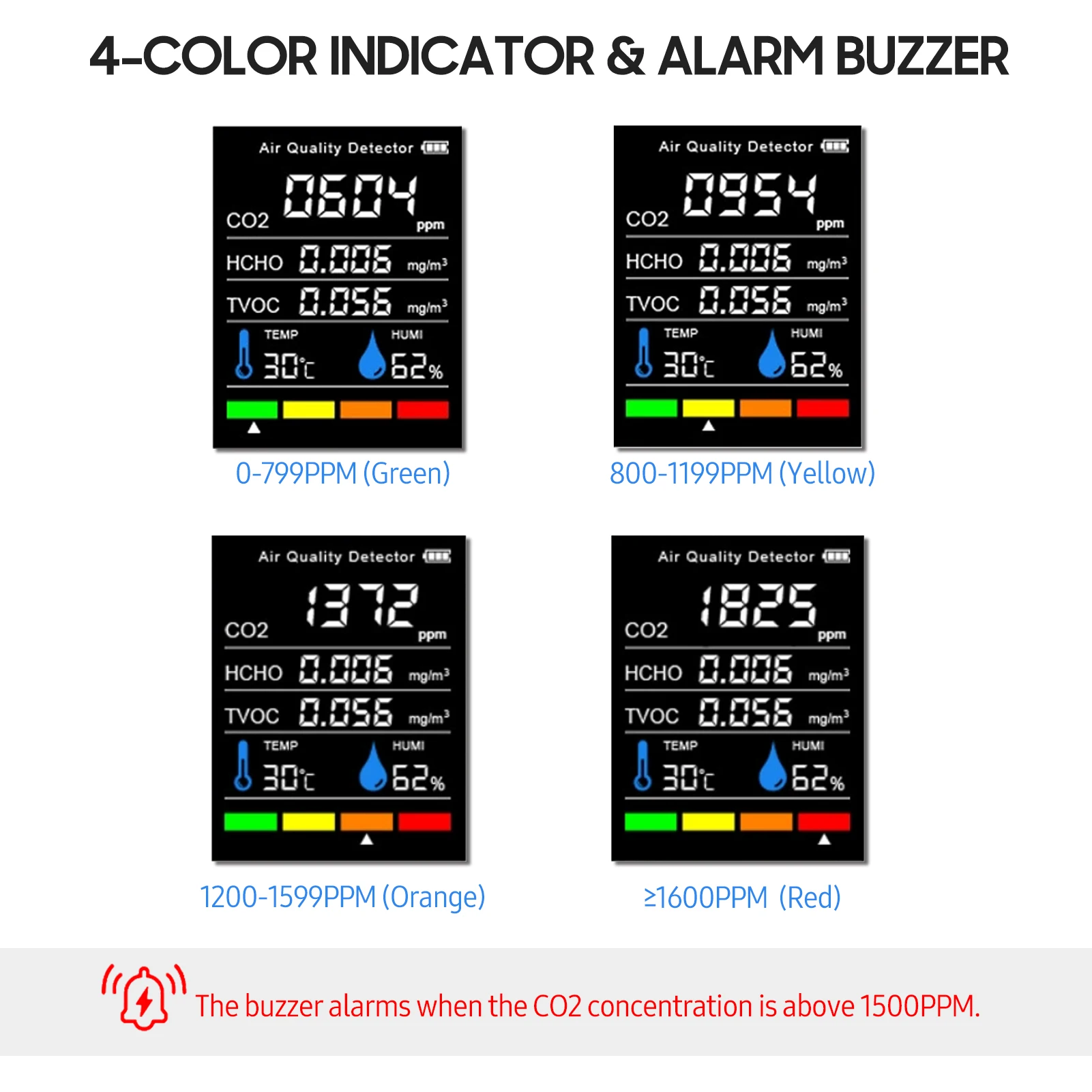 4-цветный индикатор и звуковой сигнал оповещения: 0-799PPM (зеленый), 800-1199PPM (желтый), 1200-1599PPM (оранжевый), 1600PPM и более поздних версий (красного цвета). Звуковой сигнал срабатывает при концентрации CO2 выше 1500PPM.