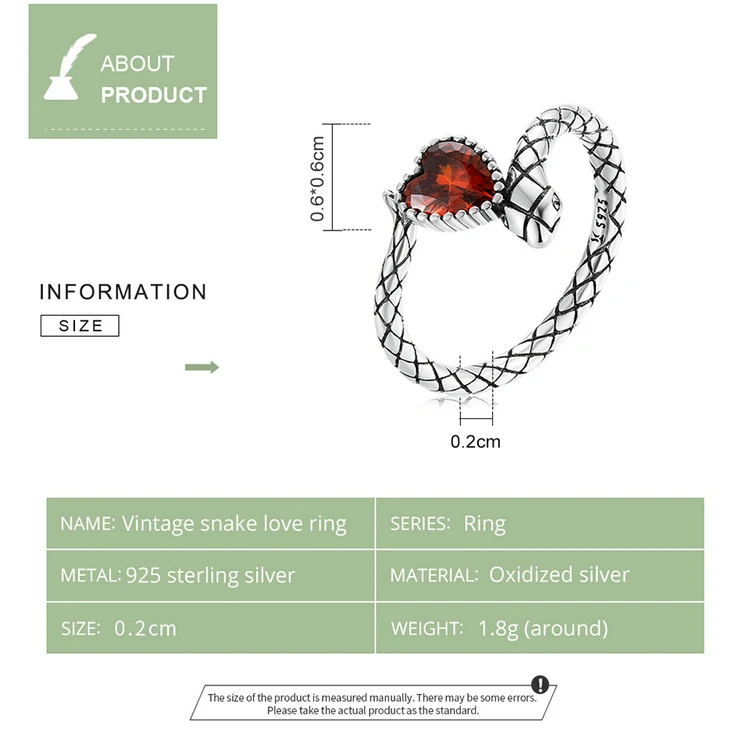 ❤[Описание] винтажное окисленное серебряное кольцо в форме змеи изысканно и уникально с текстурой змеи. Инкрустированный большим красным цирконием в форме сердца посередине, он роскошный и загадочный, означает защиту.