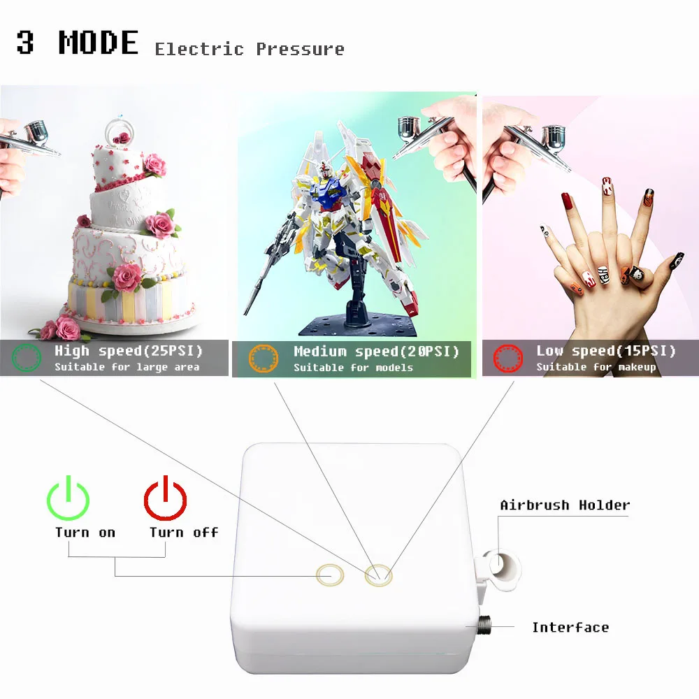 Этот профессиональный комплект воздушного компрессора airbrush широко используется в производстве моделей, украшении тортов, татуировках, Нейл-Арте и т. д. Идеально подходит для художественных работ, красоты ногтей, боди-арта, дизайнерской живописи, модельной живописи, украшения тортов, ремесел, моделей и изобразительного искусства, таких как рисование автомобиля, текстиль и футболка.
