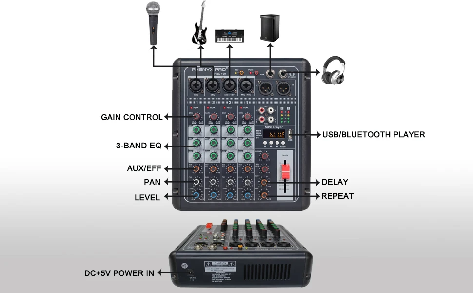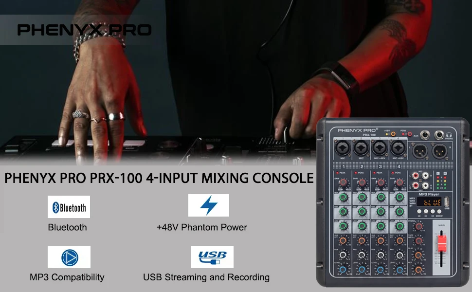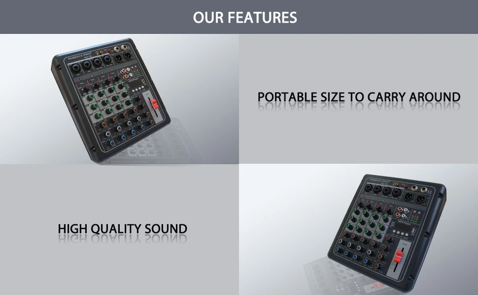 Совместим с USB/ридер со вспышкой/MP3, позволяя пользователям подключать внешний usb-накопитель или флэш-накопитель для передачи музыки в миксер. Функция BT позволяет пользователям без проводов передавать музыку с iPad и смартфона для смешивания музыки. Встроенные элементы управления для воспроизведения/паузы/переключения между режимами.
