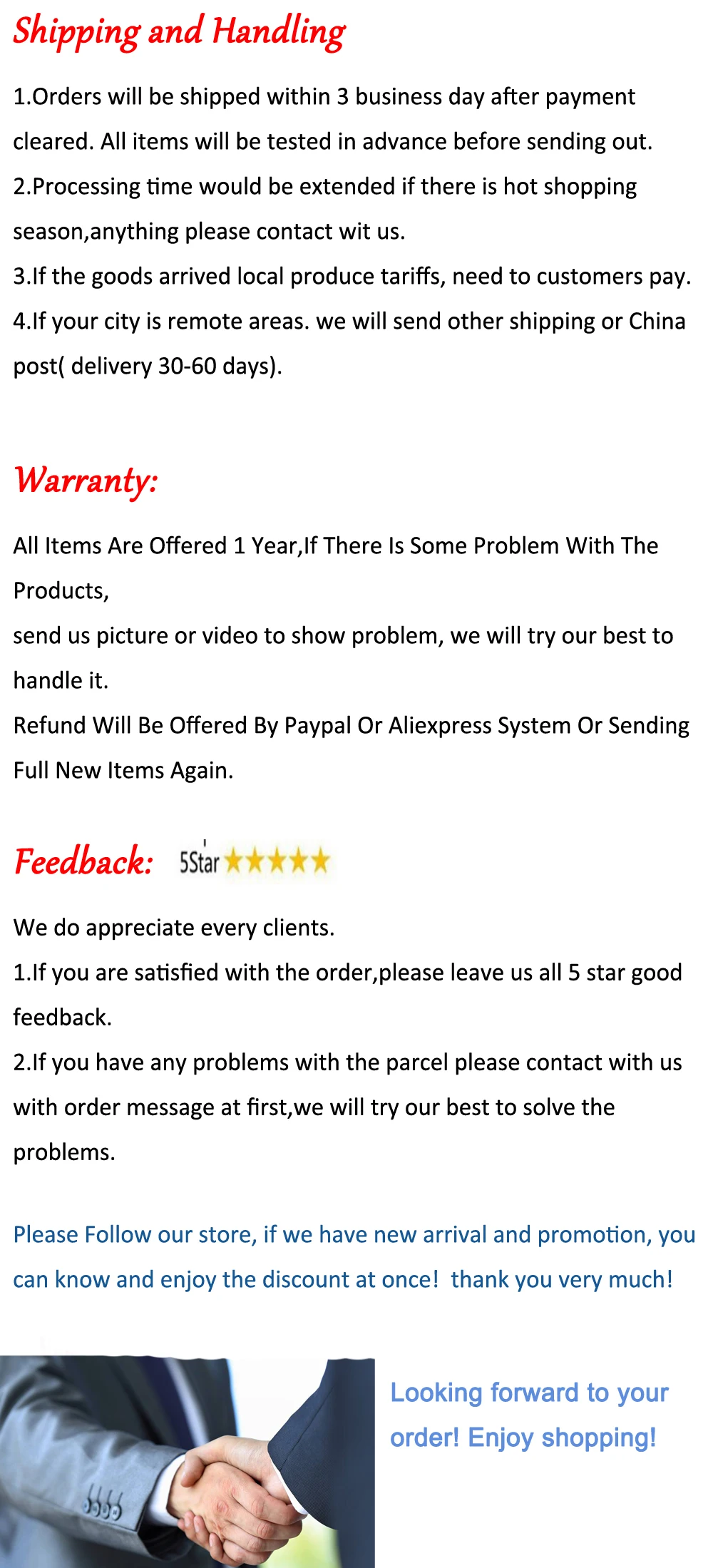 Мы ценим каждого клиента.1. Если вы удовлетворены заказом, пожалуйста, оставьте нам все 5 звезд, хорошие отзывы.2. Если у вас есть какие-либо проблемы с посылкой, пожалуйста, сначала свяжитесь с нами с сообщением о заказе, мы постараемся сделать все возможное, чтобы решить проблемы