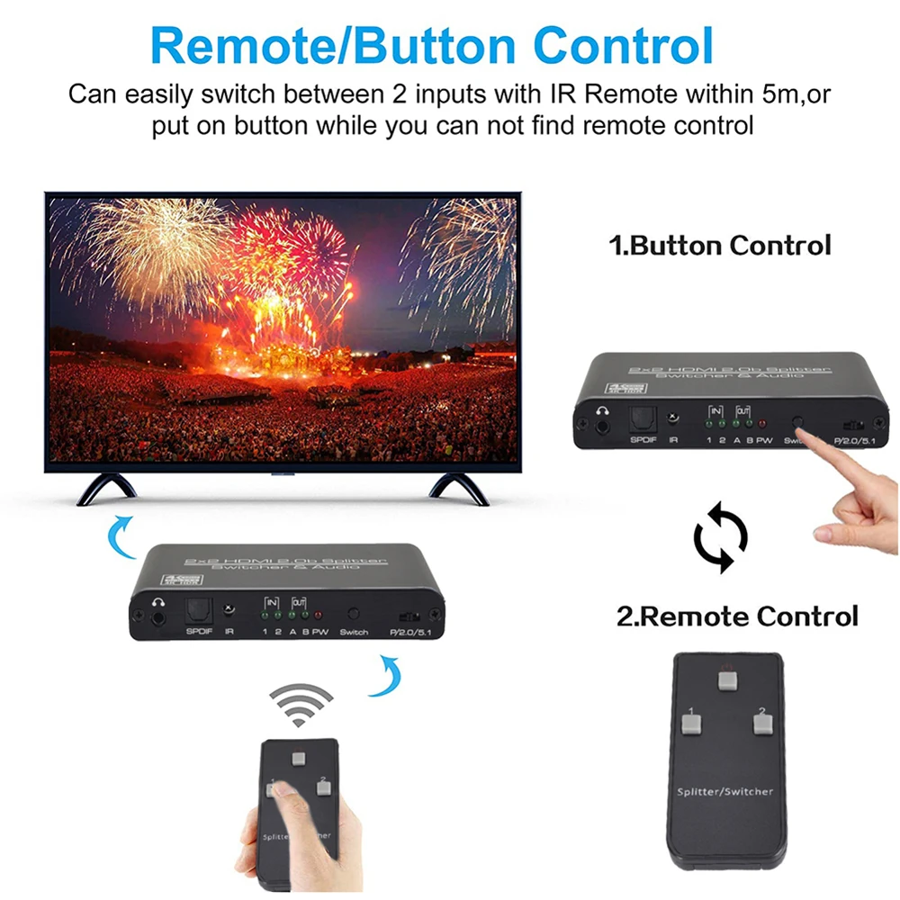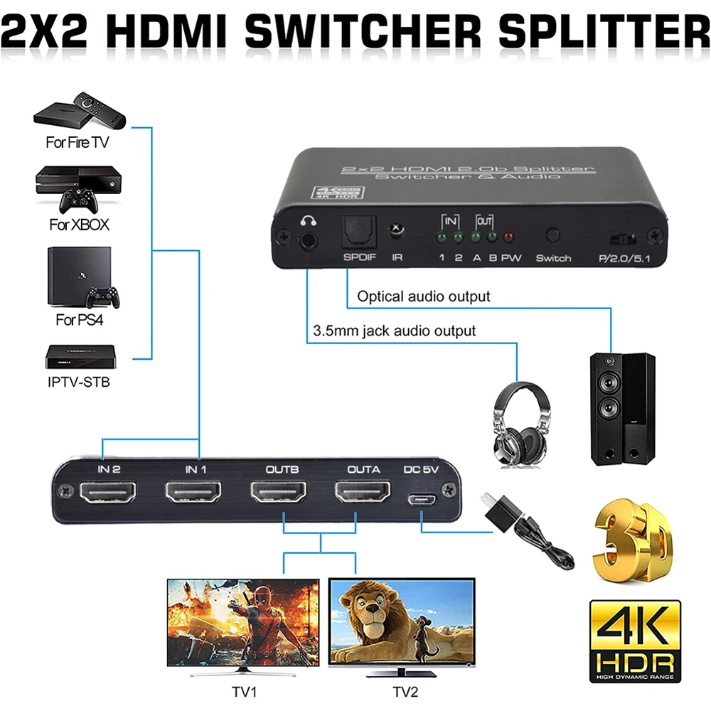 4K2K @ 60 Гц HDMI 2,0 коммутатор 2 в 2 выход с аудио HD 4K HDCP2.2 HDR HDMI 2X2 матричный коммутатор 3D HDCP 2,2 18 Гбит/с 24bit