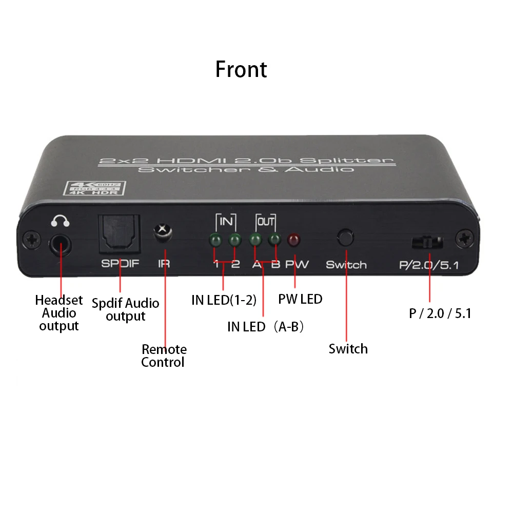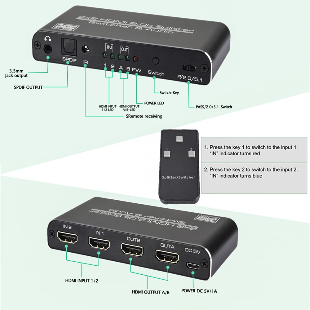 HDMI2x2 поддерживает 4K60hz, позволяет сигналы HDMI каких-либо 2 сигналов одновременно преобразовать и отображается на любой из двух подключения HDMI дисплеи, который поддерживает 3 D 18 Гбит/с, 24-битный темное время суток, высокое разрешение, аудио без потерь и другие функции, определенные спецификациями HDMI. С помощью кнопок на панели ИК удаленно контролирует, чтобы легко управлять схемой приемника источника.