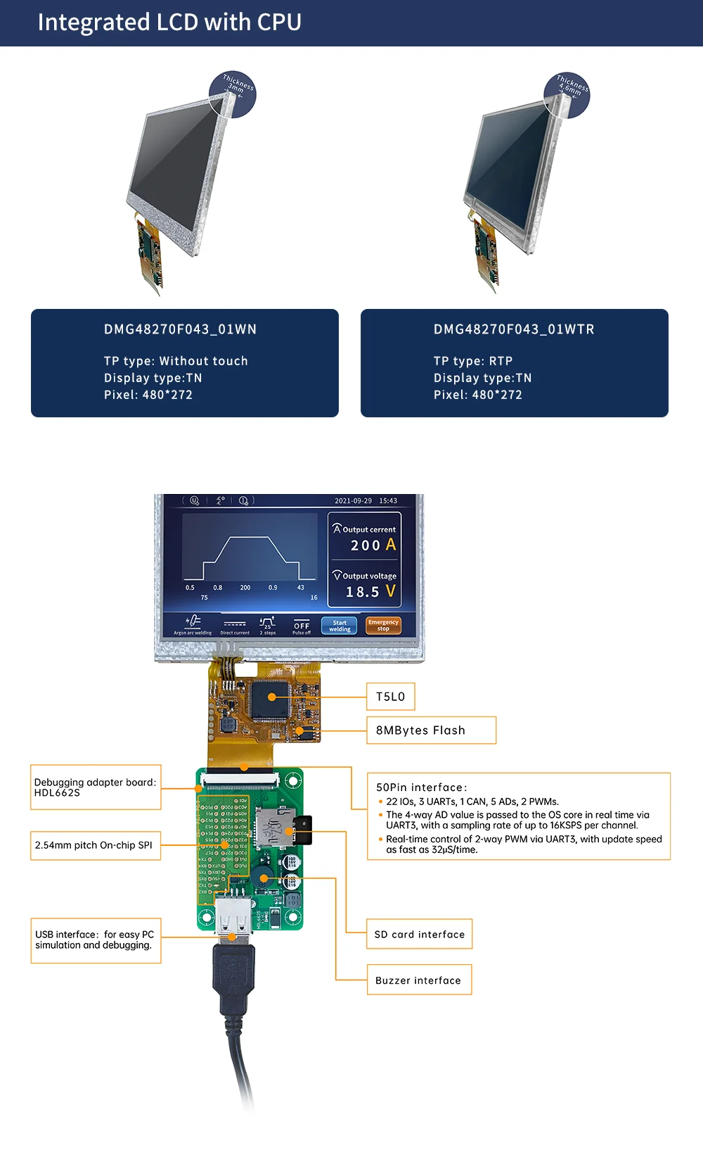 2, 4,3 дюймов, 480*272 пикселей, 262K цветовой гамме, TN-TFT-LCD, нормальный угол обзора.