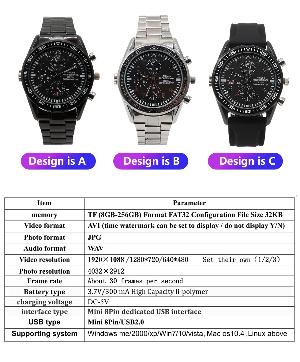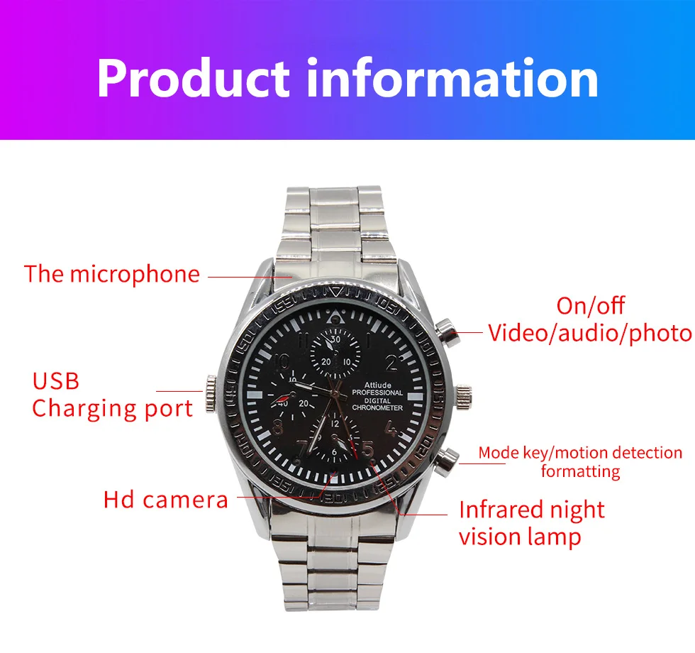 Эта камера выглядит так же, как мужские часы, поэтому никто ее не заметит. Кроме того, светильник индикатора не включается при работе. Со встроенным объективом камеры вы можете использовать его для записи того, что происходит. Качество достаточно для того, чтобы вы могли увидеть, что происходит.