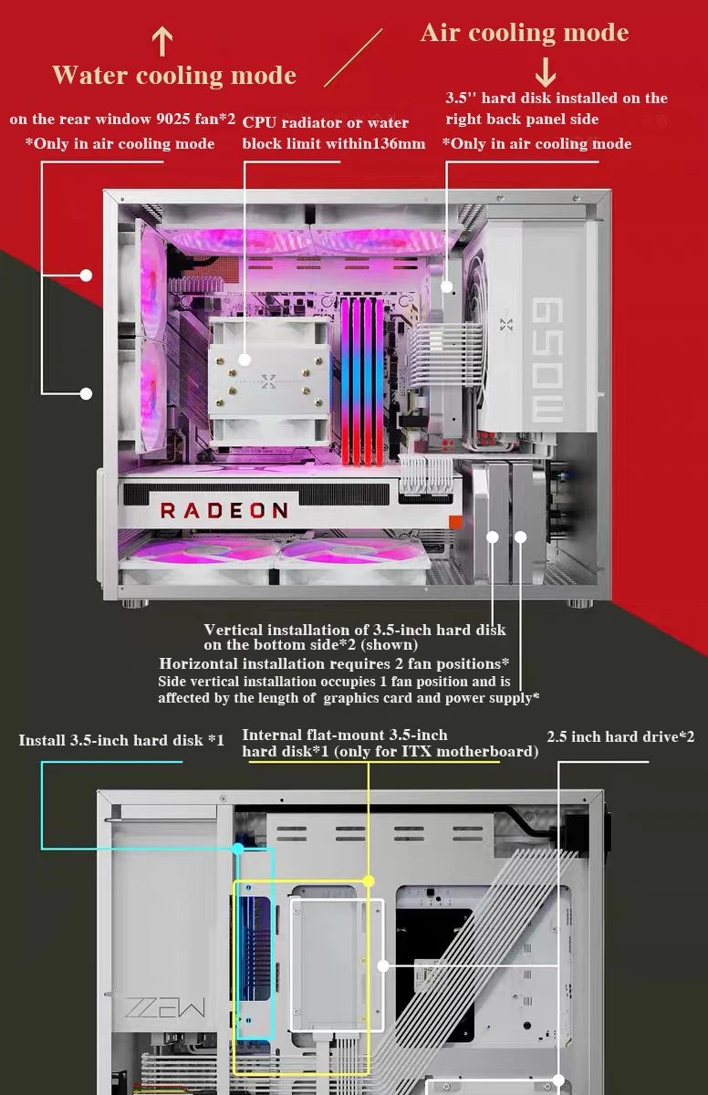Жесткий диск: Задняя часть линейная плата может быть установлен боковой или в горизонтальном положении (для Материнские itx-платы) 3,5 дюймовых жестких дисков * 1 нижней части поддерживает горизонтальной или вертикальной установки 3,5 дюймовый жесткий drivesThe 3,5-дюймовый жесткий диск Установленной в нижней части должен быть организованы в соответствии с пространство allowanceThe задняя панель поддерживает 3,5 дюйма * 1 + 2,5 дюйма * 2 жестких дисков в воздушное охлаждение modeThe задняя панель поддерживает 2,5 дюйма * 2 жестких диска в режиме водяного охлаждения