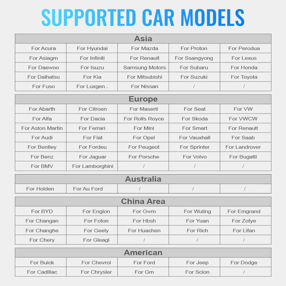 Для ACURA, для ASIAGM, для DAEWOO, для DAIHATSU, для FUSO, для HONDA, для HYUNDAI, для INFINITI, для ISUZU, для KIA, для LEXUS, для MAZDA, для LUXGEN, для MITSUBISHI, для NISSAN, для PERODUA, для PROTON, для Renault Samsung Motors, для SSANGYONG, для SUBARU, для SUZUKI, для TOYOTA,
