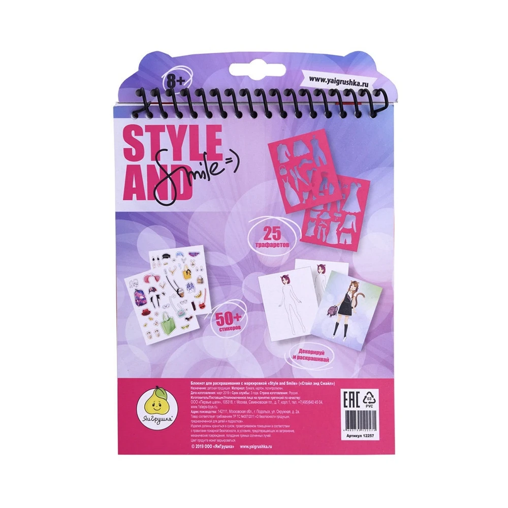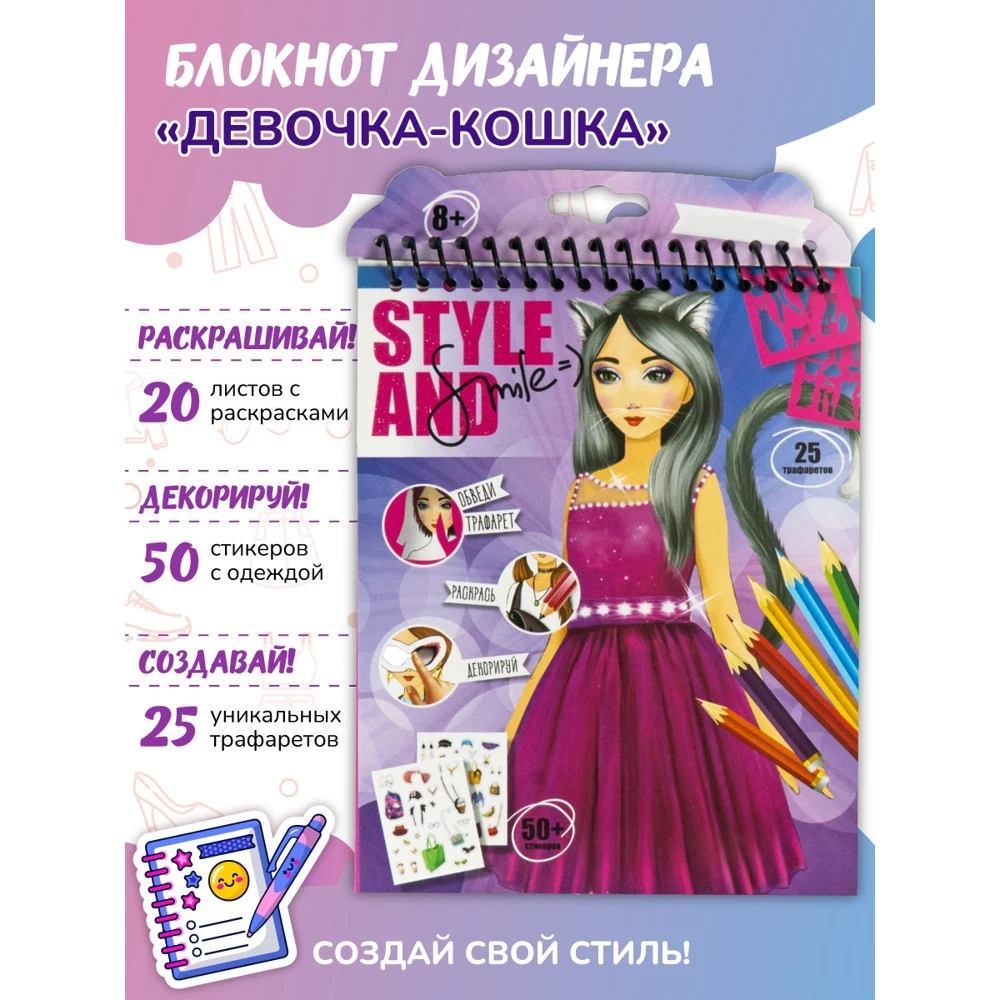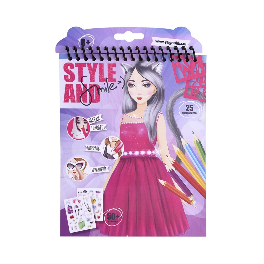 Блокнот бренда «Style and Smile» подарит возможность девочкам реализовать себя в качестве художника-модельера одежды. В блокноте множество эскизов, которые можно раскрасить карандашами, дополнить элементами одежды с помощью трафаретов, и украсить аксессуарами-стикерами.