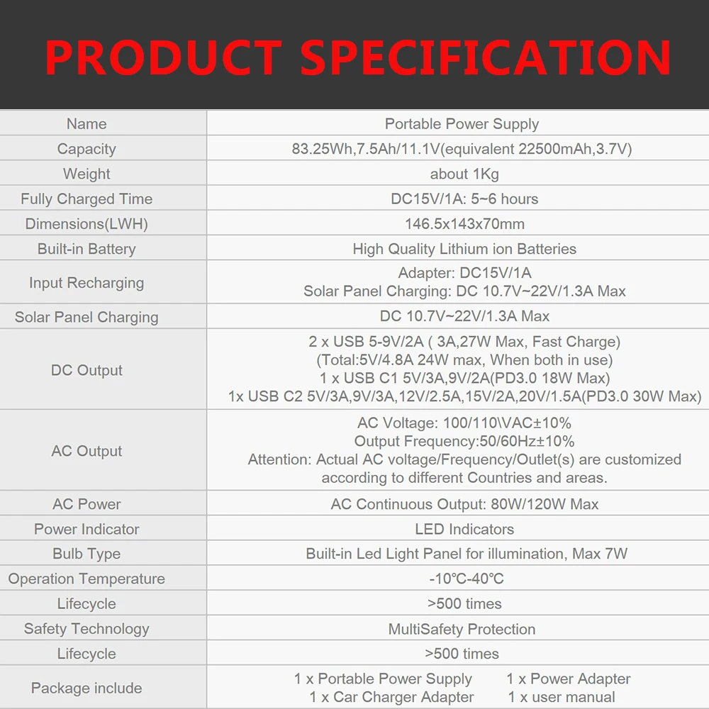 1. Большая емкость для кемпинга/домашнего резервного аккумулятора: 83,25. WH (11,1 В) Литиевые батареи, достаточно мощные для зарядки смартфонов (2000 мАч) 23 раза, Ноутбуки (56wh) 3 раза, мини-холодильник (45 Вт) около 3-9 часов. Этот генератор с питанием от батареи также очень удобен для установки на RV, campervan или где вам нужна мощность (поддержка через зарядку)