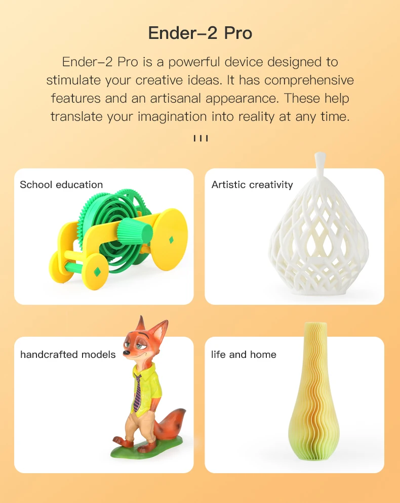 Легко управлять и осмелиться создать:Ender-2 Pro 3d принтер, недавно запущенный с 7 удобными для пользователя дизайнами. Даже для новичков, вы можете быстро начать работу и позволить творчеству течь.