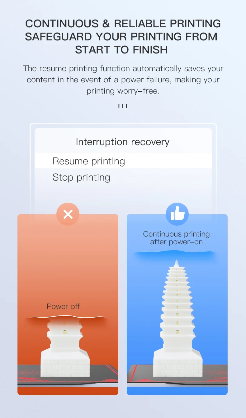 Консольная структура:Упрощенная, уникальная консольная конструкция обеспечивает легкий дизайн. С дополнительным блоком с фиксированной осью Z, он может поддерживать более тяжелые нагрузки и наклонное позиционирование, оставаясь стабильным на протяжении всего процесса печати.