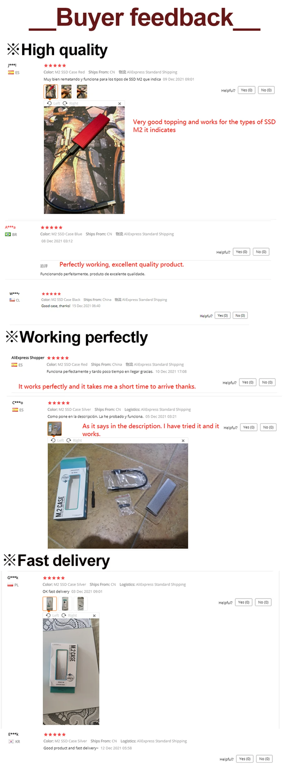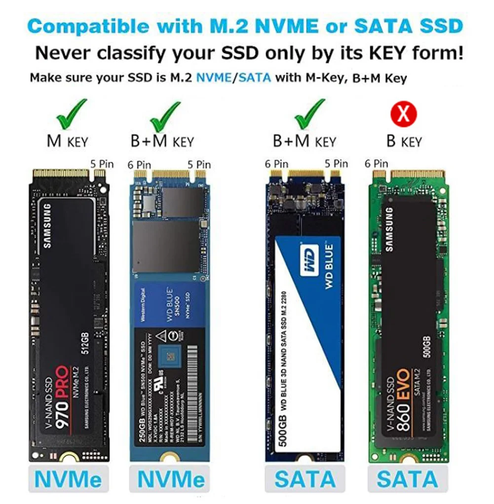Description:Dual Protocol 10Gbps Model.Support both NVME PCIe M key/M+B Key SSD and NGFF SATA protocol M+B Key SSDFeature:1. M.2 SATA NVME to USB 3.1 hard drive enclosure.2. Comply with SATA 3 specifications and comply with USB3.0 specifications.3. Support SATA NVME protocol, suitable for M2 (B+M Key/M Key) SSD.4. Support M.2 SSD, 22*30mm, 22*42mm, 22*60mm, 22*80mm solid state drives, (SSD hard drives are not included).5. The output speed depends on the type of SSD you use, SATA (6Gbps), NVME (10Gbps).6. Dual protocol uses two kinds of cables, Type-C to Type-A (5Gbps) and Type-C to Type-C (10Gbps).7. The aluminum alloy shell , which facilitates the heat dissipation of the hard disk during work and increases the life of the hard disk.8. Support UASP protocol.9. Easy to use, no need to drive.Specification: