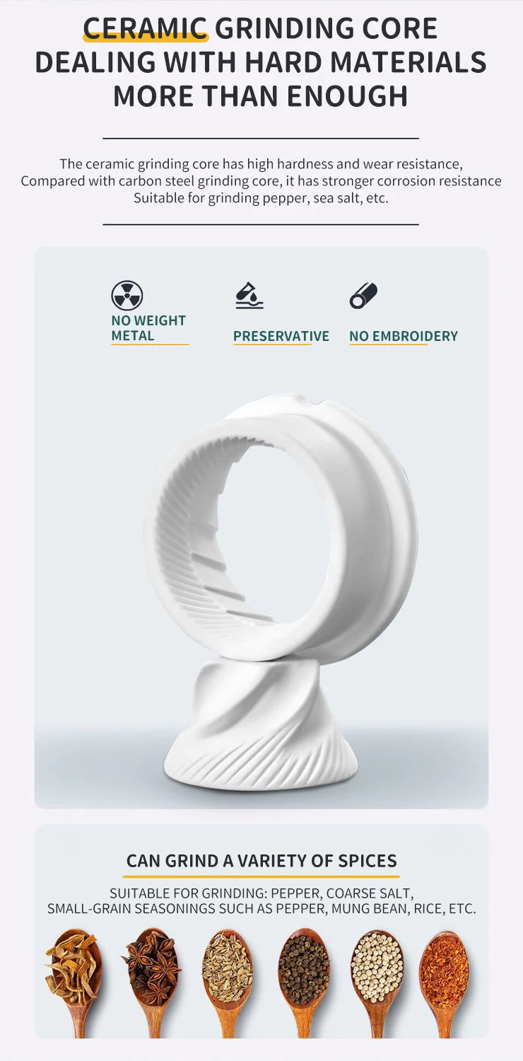 【Материал】: перцовая шлифовальная машина изготовлена из нержавеющей стали и АБС-пластика, устойчива к ржавчине и коррозии и не повлияет на аромат специй.