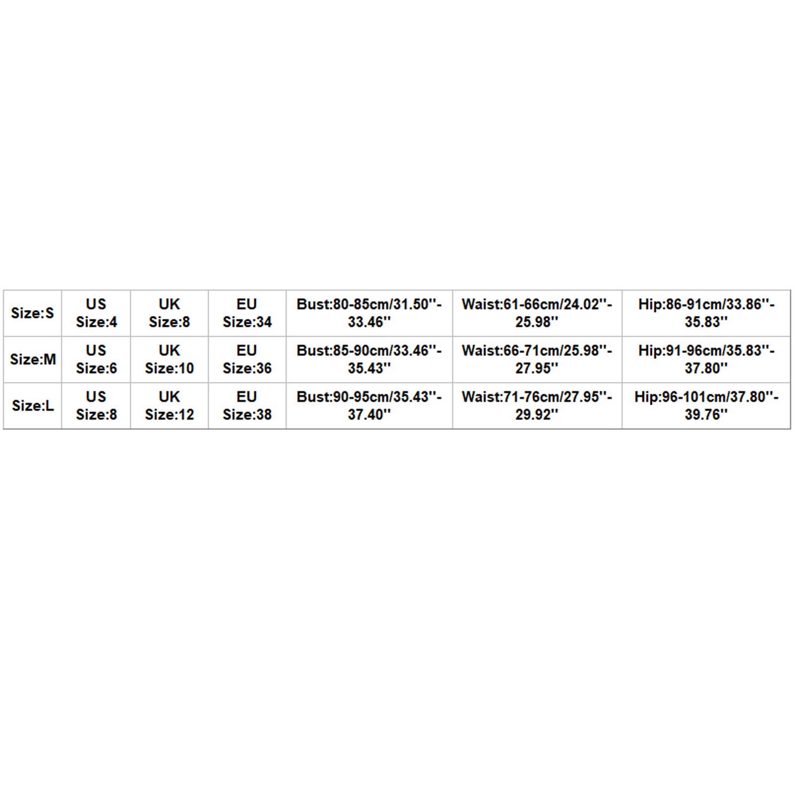 Размеры США Великобритания ЕС Bsut Талия Бедра S 4 8 34 84-88 см/33,07 ''-34,65'' 66-70 см/25,98 ''-27,56'' 86-91 см/33,86 ''-35,83'' М 6 10 36 88-92 см/34,65 ''-36,22'' 70-74 см/27,56 ''-29,13'' 91-96 см/35,83 ''-37,80'' L 8 12 38 92 см/37,80 ''-36,22'' 74-78 см/29,13 ''-30,71'' 96-101 см/37,80 ''-39,76''