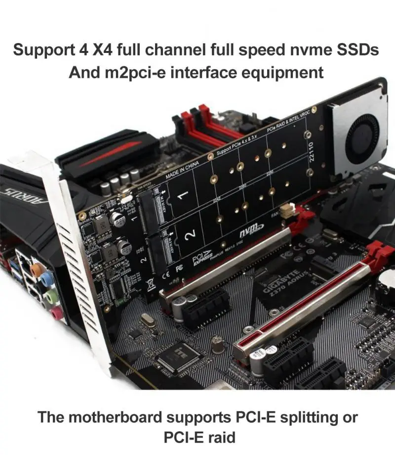 Он поддерживает четыре полноканальные NVME SSD и M.2 PCI-E устройства интерфейса X4, а материнская плата поддерживает функции PCI-E split или PCI-E RAID.