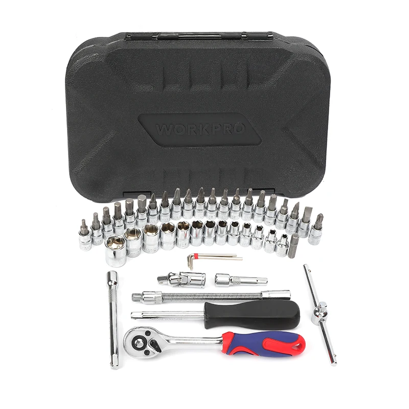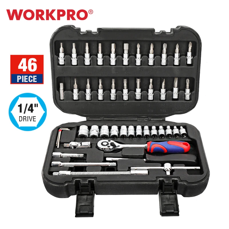 The WORKPRO 35-piece 1/4" Dr. bit sokcet set features chrome vanadium steel forged socket for torque, strength, and durability. All tools within this set meet or exceed all ANSI specifications for added safety. Ratchet handle featuresTooth gear system for high torque ratcheting. All pieces of this set fit securely within a durable blow-molded carry case for easy organization and convenient portability.