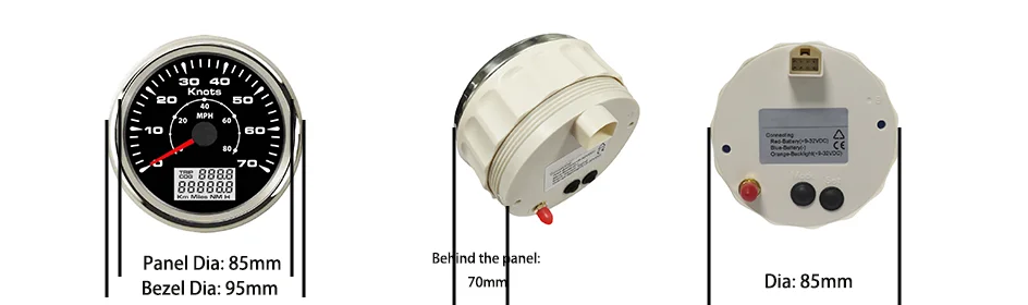 -Размер крепления: 85 мм (3-3/8 ")-Диапазон индикации: 0-70 узлов 0-35 узлов-Рабочий ток: ≤ 100 мА-Рабочая температура: -30 ℃ ~ + 75 ℃-Температура хранения: -40 ℃ ~ + 85 ℃-Подсветка:Красный зеленый синий белый желтый оранжевый фиолетовый светильник зеленый, 8 видов цветов в наличии, вы можете нажать кнопку, чтобы выбрать любой-Функции:-Игла показывает скорость тока-Светодиодное окно показывает: TRIP/COG (Выберите любой) и ODO-TRIP---TRIP01 (по умолчанию) однократного пробега, который вернется к 0 после выключения питания, TRIP02 однократного пробега, который накапливается после выключения питания, но вы можете нажать кнопку «установить» в течение 3-5 секунд, чтобы очистить данные-COG --- направление движения-ODO --- запись полных mileage автоматически и не может быть сброшена-Режим работы: ЖК-дисплей, шаговый двигательПримечания:Для этого спидометра, мы предлагаем покупателям сначала подключить черную gps-антенну/датчик, а затем подключить питание (не может подключить питание во-первых, а затем подключить gps-антенну), В противном случае будет легко повредить форму gps