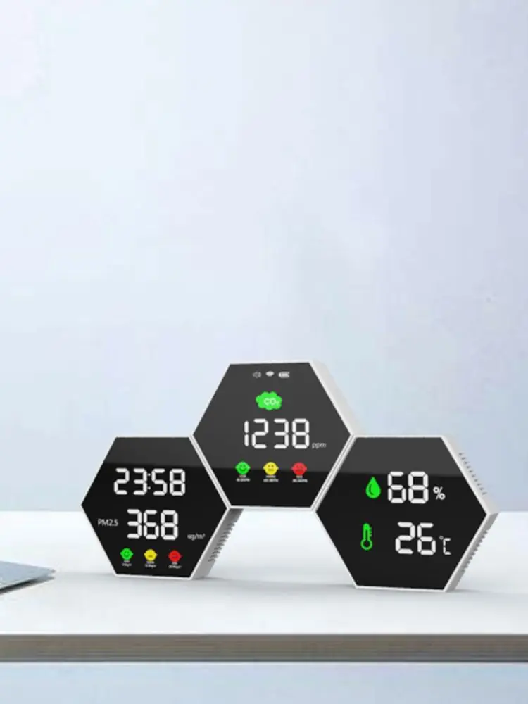 Этот продукт является настенный детектор качества воздуха, который может обнаруживать углекислый газ (CO2) и PM2.5, может отслеживаться в режиме реального времени в течение 24 часов, имеет дисплей часов, функцию сигнализации углекислого газа, И может также обнаруживать температуру и влажность в реальном времени