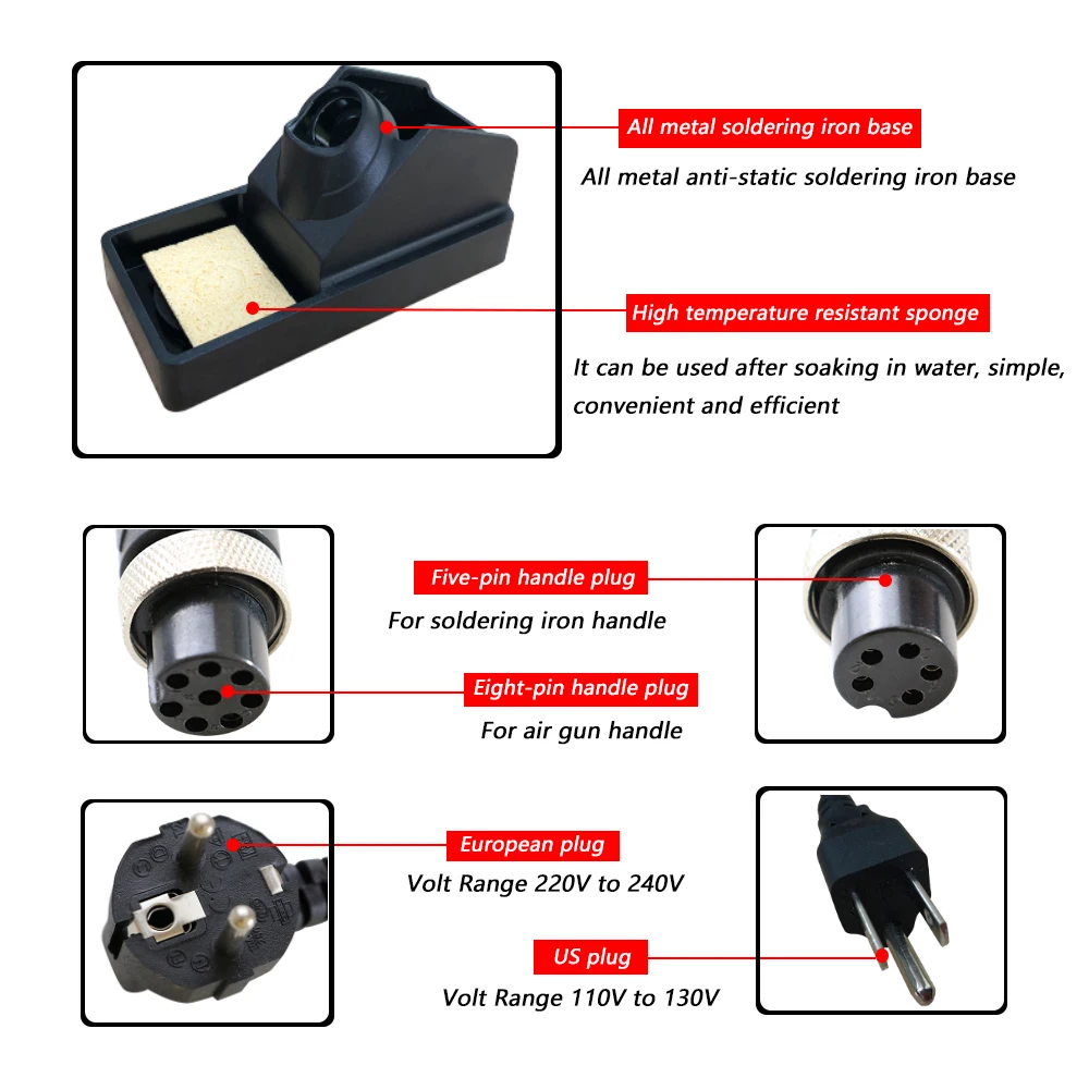Это совершенно новая паяльная станция 2 в 1 SMD 8586. Металлический корпус из сплава с высококачественным силиконовым корпусом отличается элегантным внешним видом и энергосбережением. Вы можете использовать пистолет горячего воздуха и паяльник отдельно, без помех друг с другом.